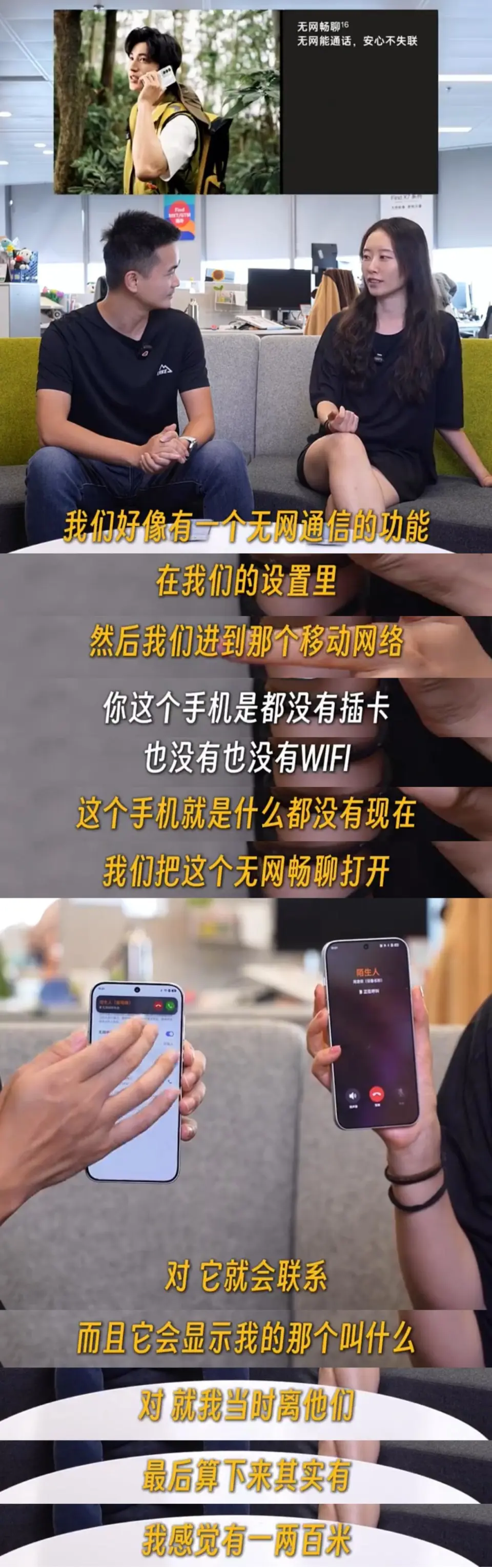 IT之家 10 月 7 日消息,OPPO Find 系列产物负责人周意保本日发布视频,视频中他与产物司理姜雨晴就 OPPO Find X8 手机举行交换,并表现 FInd X8 手机将全系标配无网畅聊功能。 据介绍,无网畅聊功能是使用蓝牙技能,办理近场通讯题目,实用于出国旅游、戈壁徒步、无人区探险、户外爬山,大概演唱会等场景使用。 姜雨晴称,她与父母其时间隔约莫一两百米,开启该功能后顺遂联系到了对方。该功能预计可支持超百米间隔使用。 IT之家此前报道,OPPO Reno 12 系列手机首发支持无网通话功能。OPPO 官网对该功能举行解释:该功能工作频率、功率符合国家无线电管理的有关规定。请服从民航局相干规定,克制在飞机上使用该功能。手机的通话效果和连网稳固性与环境复杂程度有关,请以实际体验为准。 |