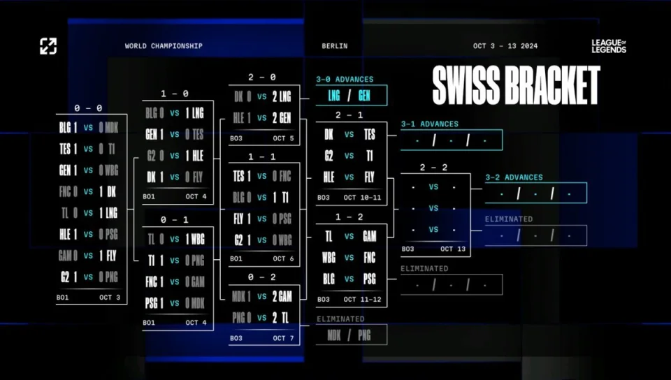 IT之家 10 月 8 日消息,《好汉同盟》2024(S14)环球总决赛瑞士轮第三轮比赛已全部竣事,第四轮的对阵与赛程也已正式出炉。 在第三轮比赛中,位于 2-0 组别的 LPL 战队 LNG 以 2:0 的比分战胜 DK 率先以 3-0 的大分晋级八强,位于 1-1 组别的 TES 在 BO1 中战胜 FNC 来到 2-1 组,别的两支位于 1-1 组的 LPL 队伍 BLG、WBG 则均负于对手跌入 1-2 组。 别的IT之家还注意到,在第三轮比赛中 LCK 战队 GEN 同样以 3-0 出线,MDK 和 PNG 两支队伍则以 0-3 的结果告别了本次环球总决赛的舞台。 在接下来的瑞士轮第四轮 BO3 对决中,TES 将面临 DK,BLG 对阵 PSG,而 WBG 将遇上 FNC。 TES vs DK 的比赛将作为第四轮的首场比赛于北京时间 10 月 10 日 20:00 开战;BLG vsPSG 的比赛约莫将在 10 月 11 日 23:00 举行;WBG vs FNC 的比赛则会落在 10 月 12 日 20:00。 |