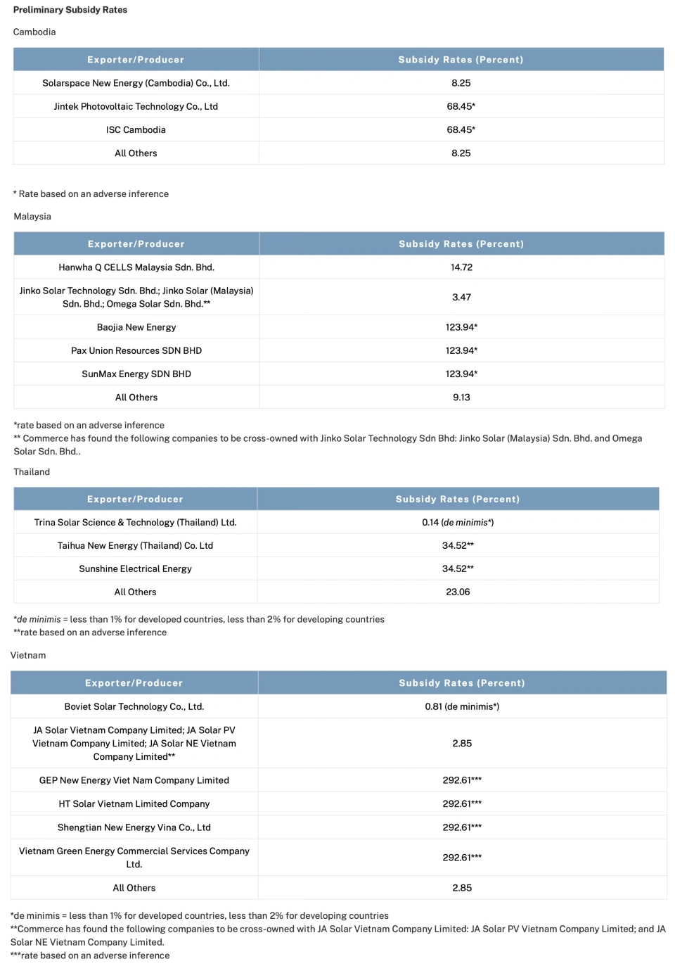 美国对东南亚四国光伏反补贴初裁结果公布。 10月1日,美国商务部宣布了其对来自柬埔寨、马来西亚、泰国和越南的晶体光伏电池(无论是否组装成模块)的反补贴税(CVD)观察的开端裁定。同时声称,美国商务部正在对柬埔寨、马来西亚、泰国和越南的太阳能电池举行反倾销税观察。 美国国际商业管理局官网公布的表格数据表现,有四家在越南建厂的企业初裁反补贴税率最高,达292.61%,包括Shengtian New Energy Vina Co.,Ltd等;三家在马来西亚建厂的税率达123.94%,包括Baojia NewEnergy等。 在被观察公司中,天合光能(688599.SH)的泰国工厂税率最低,为0.14%。其他中国龙头光伏企业中,晶科能源(688223.SH)马来西亚的工厂税率为3.47%;晶澳科技(002459.SZ)越南工厂税率为2.85%。 这意味着,此次反补贴初裁对这三大龙头的影响并不大。 天合光能干系人士对界面消息表现,公司税率相对较低主要因此前所得到的补贴少,市场化程度高。 别的,据界面消息相识,表格中没有涉及到的非应诉企业工厂,或按照均匀税率来实行。 中国有色金属工业协会硅业专家组副主任吕锦标对界面消息表现,从反补贴初裁结果看,差异的企业税率差异,主要因被观察企业披露的所得补贴量差异,它们在差异时期入驻差异国家,得到的补贴认定有所差异。 彼时,为了吸引企业到本地投资,东南亚四国给予干系企业肯定的优惠。现在初裁结果中,在越南企业的税率更高,也是本地此前更急于吸引外资的表现。 反补贴是指入口国主管政府根据其国内干系财产的申请,为了掩护受损的国内财产,恢复公平竞争,观察补贴入口,并通过征收反补贴税或代价答应抵消入口产品享受的补贴。反补贴是补贴的陪同,也是入口国反击出口补贴国家的行为。 本年5月,应美国太阳能制造商业委员会(American Alliance for Solar Manufacturing Trade Committee)此前提交的申请,美国正式对东南亚四国光伏产品发起新一轮反倾销和反补贴观察。 上述案件涉及美国海关编码8541.40.6025、8541.42.0010、8541.40.6015和8541.43.0010项下产品以及8541.40.6015和8541.43.0010项下部门产品。 彼时外媒报道称,美国商务部预计于7月18日作出反补贴初裁,10月1日作出反倾销初裁。现在看来,双反的裁决结果公布时间晚于预期。 美国国际商业管理局官网的内容表现,美国商务部将操持在来岁2月公布反补贴终裁结果。别的,东南亚四国的反倾销税率初裁还未公布。 吕锦标称,相对于反补贴税率,企业应该更关注反倾销税率。据界面消息相识,通常反倾销的税率会更高。 在新一轮双反观察的悲观预期下,本年6月,业内传出中国光伏企业部门东南亚产线关停的消息。彼时,隆基绿能被曝其在马来西亚和在越南电池片工厂的部门产线歇工,且天合光能也有生产操持的调解。 界面消息留意到,此次反补贴初裁结果并未涉及同在东南亚四国拥有产能的隆基绿能。有业内人士对界面消息称,这或是由于近两年隆基绿能自东南亚出口到美国的产能已经有所镌汰,其美国市场主要依赖本地的工厂供货,以是被制裁的须要性有所削弱。 隆基绿能董事长钟宝申在此前业绩会上称,过去由于各种商业政策的限定,从中国直接出口美国的产品几乎是0。从东南亚出口到美国,税率也将越来越高,最终裁决结果大概和此前的发起税率不会有大差异,越南及马来西亚、泰国的组件进入美国已不具备条件,后两者的电池还有肯定机遇。 此次美国对东南亚太阳能产品的双反观察最早源于4月24日。 双反请愿书由美国太阳能制造业同盟商业委员会提交,涉及企业包括美国太阳能制造商Convalt Energy、First Solar、Meyer Burger、Mission Solar、Qcells、REC Silicon和初创公司Swift Solar。委员会由华盛顿特区状师事务所Wiley Rein LLP代表。 2022年,美国也曾启动对东南亚四国光伏产品提起双反观察。本年6月,反规避宽免期竣事。 据中国光伏行业协会此前统计,中国已有近20家光伏企业通过合资、并购、投资等方式在东南亚地域结构光伏生产。隆基绿能、晶科能源、晶澳科技、阿特斯、东方日升、正泰新能源、协鑫集成等多家中国头部光伏企业均在东南亚地域有所结构。 东南亚通路受阻后,在美国、中东等国家或地域建厂,成了部门中企的新选择。 |