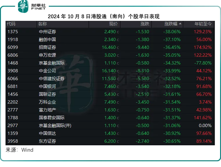 “十一”期间独自尊涨的港股,在A股开盘之后,反而迎来了大幅调解。刚富故窍两万三的恒生指数高处不胜寒,在两万三停留不到一个买卖业务日即掉头大跌2172.99点,至20,926.79点,日内曾一度低见20,762.82点;恒生科技指数大跌12.82%,收报4,695.81点,皆回到了“十一”假期之前的水平,仿佛假期期间港股的大涨从未发生。 A股也先涨后回,高开10%的上证指数,收市涨幅缩小至4.59%,收报3489.78点;深证成指则收涨9.17%,报11,495.10点;创业板指大涨17.25%,收报2,550.28点。 可以或许让大家感受到与假期前差异的是,港股的单日成交额与A股一样飙升至史上罕见的水平。 A股沪深总成交额达3.45万亿元人民币,较上一个买卖业务日放量8589亿元人民币,远高于本年以来的日均成交额约8千亿元人民币。 港股的单日成交额也大增至5000亿港元,较上日大增一倍以上。 港股大跌的缘故原由安在?今早发布会上没有如预期那样释放更多的经济救济,短期谋利资金出逃是其中一个缘故原由,另一个缘故原由大概是憋了一个长假,担心错过A股行情的南向资金返回A股市场,拖累了港股体现。 财华社留意到,在港股早上开盘后,港股通卖盘陡增,或反映南下资金涌出,见下图,十点四非常左右的南向净卖出增至70多亿,而在午后三时A股收市后,南下资金再度流入,南向净卖出变成净买入,港股收市时的南向净买入额增至20.66亿。 另一边厢,A股收盘后开始的欧股甫一开市也大跌,重要受LVMH、爱马仕、开云、欧莱雅等奢侈品牌大跌拖累,市场预期中国市场的刺激步伐或未如预期到位,或拖累对这些品牌产物的需求。别的,欧盟掀起的不受接待汽车贸易摩擦,或也让市场担心宝马和梅赛德斯-疾驰(Mercedes-Benz)受到牵连,两家豪车品牌的股价也下跌2%。这些都反映出国际资金对于原来经济政策的预期有多高。 2024年10月8日,港股通南向体现显着掉队,上涨的股份只有12只,持平的有4只,而下跌的到达529只,跌幅最大的是假期期间体现最好的券商股和内房股,中州证券(01375.HK)跌38.06%,招商证券(06099.HK)和申万宏源(06806.HK)分别下挫36.45%和35.05%;融创中国(01918.HK)、万科企业(02202.HK)和富力地产(02777.HK)分别下挫37.10%、31.54%和31.51%,见下图。 与此同时,前一个买卖业务日还有数只港股股价较其对应的A股具有溢价,但是到10月8日,全部的溢价均被抹去,AH同步上市的港股中,H股股价全低于其对应的A股股价。 受港股体现拖累,中概股盘前已开始大跌,阿里巴巴(BABA.US)盘前大跌8.57%,拼多多(PDD.US)大跌12.27%,京东(JD.US)盘前大跌11.32%,携程(TCOM.US)大跌10.39%,百度(BIDU.US)盘前大跌9.02%,贝壳(BEKE.US)和富途(FUTU.US)盘前更分别大跌16.30%和17.82%,蔚来(NIO.US)、小鹏(XPEV.US)和抱负(LI.US)盘前分别下挫12.96%、11.24%和12.03%。 反映B股、H股和红筹股总市值最大50家上市公司体现的富时中国50(830008)跌10.44%,报14579.45点,新加坡上市的富时中国A50期货跌10.83%。 中概股彻夜将迎往返调。 作者:吴言 |