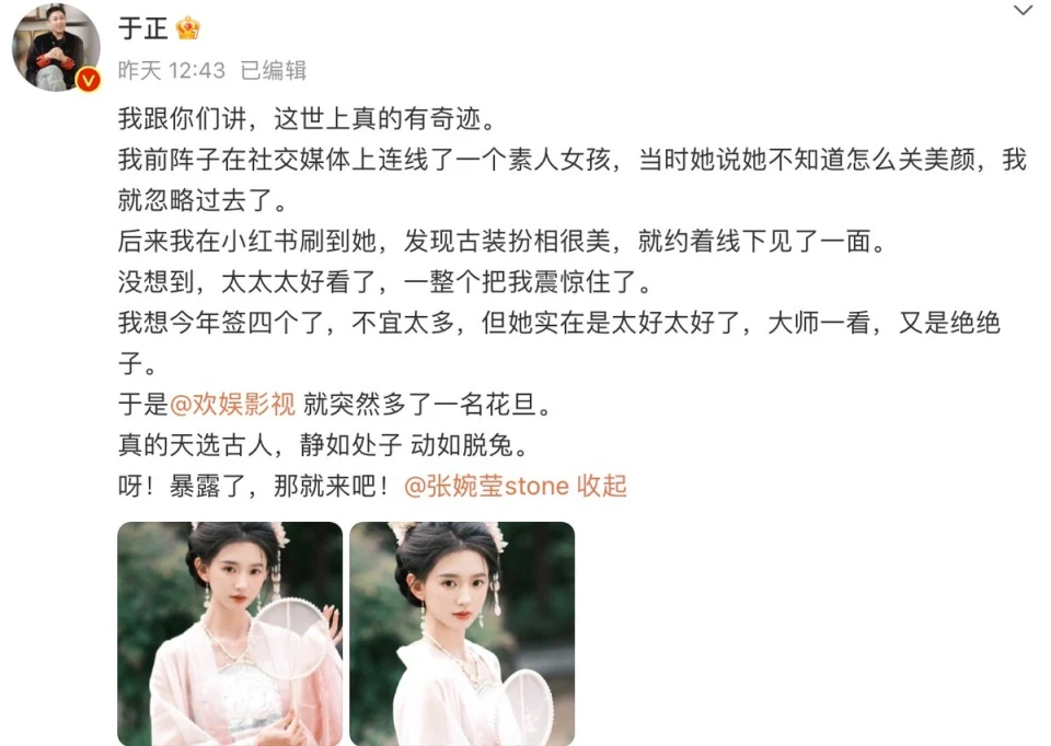 文 | 安青 编辑 | 9527喵咕君 于正绝对是算是“内娱活人”的代表,他经常口出“狂言”,时不时碰瓷顶流,偶尔间狠起来连自家的艺人都坑。 吴谨言曝出婚讯,热度发酵得比炮还快,多亏了于正的“仗义执言”,推波助澜。 同样作为于正力捧的小花,白鹿稳固发展,打开着名度,结果于正跳出来为内娱的女明星排序,直接让白鹿卷入饭圈之争,堪称无妄之灾。 在这些热点事故里,于正充当的脚色就是助推器,凭借圈内的人脉资源,资历和话语权,于正语出惊人,偶尔间连专做娱乐范畴的博主都自愧不如。 但该说不说,观众对于正的态度是矛盾的,他偶尔间的发言相称迷惑,可审美却很稳固,从从前间的《宫》到厥后的《延禧攻略》,以及今年上线的《墨雨云间》都能证明,于正对于热剧的把握不是偶尔,而是真有两把刷子。 在于正的资助下,也有许多演员从寂寂无闻到冲进一线,现在的白鹿,此前的李一桐、吴谨言,许凯,都是于正力捧,且真正捧出圈的网红。 只管此中有人的条件不被全部人承认,但毋庸置疑现在的于正一个人顶起了国产剧青年演员的造星半边天,以至于每年于正新签了什么演员,都能先火一把。 而今年,于正又签了一位颜值扛把子,10月8日,于正在自己的社交平台分享了自己签约新人的动态,表现自己在社交媒体上接洽了一个素人女孩,但忽略了,厥后再度在社交媒体上刷到后主动联络,线下一见,立刻告竣了互助。 于正以最平常的预期,官宣了自己新签的花旦,而这个女孩网名“张石头”。 从于正晒出的古装照来看,女孩简直有着浓厚的东方韵味,古装气质,但网红这个圈子一向都是靠滤镜、打光和修图,曾经大火的易梦玲,在自媒体里就是女神人物,结果和明星同框就被吊打,头大肩窄、比例不好,全部被直播间大灯粉饰的瑕疵,在高清镜头下完全藏不住。 在没有看到张石头的生图之前,许多网友也默认于正新签的女演员也是见光死的范例,但没想到,这女孩真美出了让网友不由得惊呼的水平。 她简直就是天生的上镜脸,头小脸小,五官风雅,简单的发型也藏不住她清秀的长相,在张石头这张脸上真的找不到半点儿瑕疵,她面部线条很流畅,风雅美的同时尚有着自己的辨识度,而光靠着仙颜,张石头就火过一次了。 此前,张石头在河南开封科技传媒学院任职毛概老师,她在讲台上穿着简单的玄色西装,戴着眼镜,披着头发的样子被拍下来上传到网上,结果灵敏蹿红,靠着仙颜气质带来的热度,张石头小火出圈。而实在没想到这位靠着颜值小火的素人,被于正挖到了。 现在张石头的社交账号已经正式更名为张婉莹,这个名字听起来有些平凡,但颜值简直不平凡,不少网友在看到张婉莹的照片后都被狠狠惊艳,有网友直言“好漂亮,生图比精修悦目”、“这脸小的……有几张五官分布让我以为是ai换脸”,以致有网友搬出了公认的女神,称“我以为眉眼有些像林志玲诶”。 细看张婉莹的照片就会发现,她简直是御姐的体态,妩媚的化身,她身材高挑,四肢纤细,头肩比优秀,不必要任何氛围营作育是硬“美”,而她的眉眼的简直确和林志玲有几分相似。 她额头饱满,眉骨不算立体,但是与额头的衔接恰到长处,眉毛略显英气,可眼睛属于媚骨天成的媚惑系,就是这眼神中表暴露的媚,让不少网友以为张婉莹和顶峰时期的林志玲有几分相似。 以致说真话,张婉莹的五官比林志玲还要调和,林志玲是公认的玉人,但是鼻子细长,鼻尖小巧到有些局促,偶尔也会给人一种夹着放不开的感觉。 但是张婉莹不但有着立体的鼻梁,尚有着大小适中的鼻型,她鼻子上微微的肉感,都让她的五官更为调和。 唯一遗憾的是张婉莹现在入圈是晚了点儿,演艺圈的许多女明星都是十几岁就入行,25岁基本上都有不少代表作了,但张婉莹的25岁才刚刚起步,在卷颜值的这个赛道里,张婉莹的黄金期就是比其他人更范围一些。 再加上现在的影视剧资源很有限,不但观众没有耐烦,投热钱的资源也没有耐烦,以是张婉莹入圈的每一步都得是有水花的,才有人乐意等她发展,等她证明。在更短的时间内拿出高质量的表现,并不简单。 固然,有些天赐的仙颜躲都躲不外,张婉莹的美真的是老天爷追灼?乒吃的水平,她的怼脸生图,真的在内娱都找不到代餐,何况正如于正所言,“快马加鞭就好”,积极总会有回报。 现在于正对于张婉莹的偏幸已经有目共睹,后期估计就是大量的资源投入,是小火照旧爆红,就要看这张脸能不能搭上演技这张王牌了。毕竟在硬件条件上,张婉莹要比白鹿还要精彩。 只是张婉莹才刚刚拥有姓名,就惹出了一些非议,有网友传言爆料张婉莹“知三当三”,但很快张婉莹本人和于正都站出来澄清,张婉莹以致孤身前去派出所行政案件存案的回执。 光是这一点,就看得出于正和张婉莹本人都有十足的底气面临各种飞短流长,谎话抹黑。 而这对于张婉莹来说也仅仅只是一个开始,以如许的面庞进圈,资源的瓜分是一定的,张婉莹能不能在激烈的竞争中站稳脚跟,靠于正的力捧,更要靠她自己的气力。固然面临舆论的强盛内核,也是必须的。 最后,你对于正新签约的女演员有什么见解?能不能get到张婉莹的颜值魅力?在批评区加入讨论,猜测一下张婉莹进演艺圈后的发展势头吧。 |