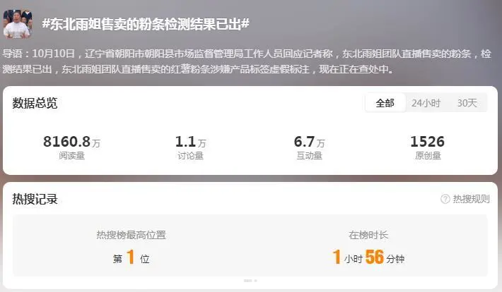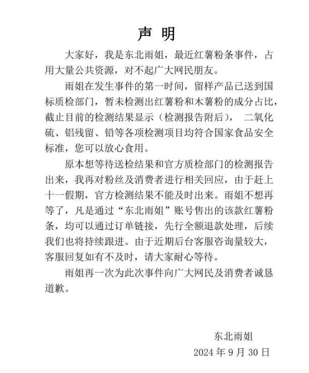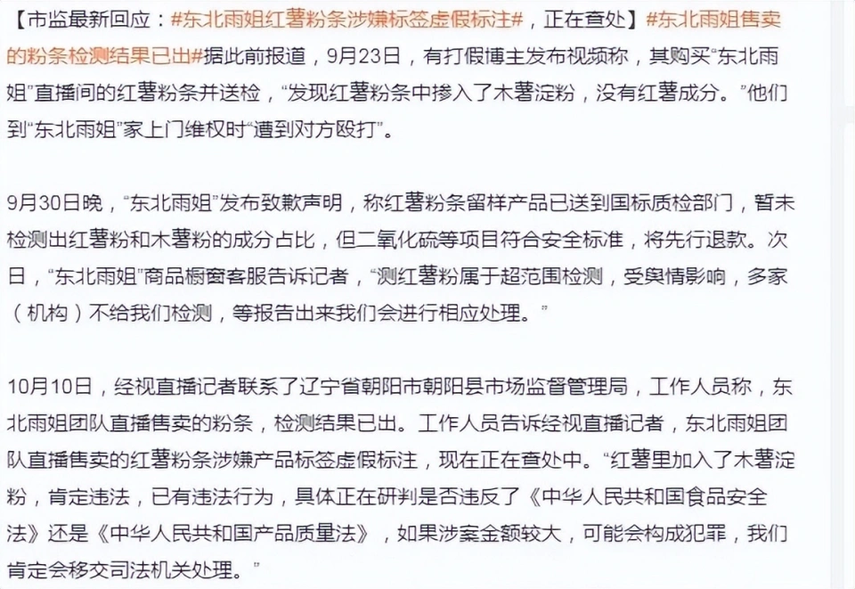 网红东北雨姐传来一个最新消息。 东北雨姐售卖的粉条检测结果已出。 如许一个消息,冲上热搜榜第一位。 有媒体接洽官方机构,扣问东北雨姐售卖的粉条检测结果。 厥后,官方的工作职员告诉媒体记者,东北雨姐团队直播售卖的红薯粉条,涉嫌产物标签虚伪标注。 也就是如许一个结果,引发浩繁网友的猛烈反响。 究竟,网红人物东北雨姐进行直播带货的产物,正是广大网友买单的。 现如今,东北雨姐售卖的粉条检测结果已出,从而告诉网友们一个最真实的答案。 如此一来,网红东北雨姐,该怎样表明? 从东北雨姐迩来的消息来看,也就是国庆假期前夕。 东北雨姐在9月30日发布了一个声明。 东北雨姐在声明中提及红薯粉条变乱,信息量好大。 东北雨姐坦言,她这一次占用大量公共资源,对不起广大网民朋侪。 但重点内容是,东北雨姐的变乱发生的第一时间,她把留样产物送到有关部门检测。 从而带来“符合食品安全尺度”的结果。 值得一提的是,东北雨姐还特别夸大:从“东北雨姐”账号售出的该款红薯粉条,均可以通过订单链接,先行全额退款处理。 末了,东北雨姐表达了对网友和消耗者的歉意。 由此可见,东北雨姐的这个声明,可谓是态度光显。 她既表达了自己对于红薯粉条的态度,又分析白售后题目标处理方式,从而给消耗者一个很好的交接。 由此可见,东北雨姐的处理方式,便是一个最佳的结果。 还应该看到的是,东北雨姐的一个外交账号,在国庆期间制止了更新。 如许一个反常的结果,令人深思不已。 是不是东北雨姐在国庆期间,有事耽误了,从而让自己不能拍摄视频大概到场直播带货? 从东北雨姐过往的视频发布规律来看,她一样寻常都会在巨大节假日进行视频更新,从而增进与网友的互动。 因此,东北雨姐的最新动向,也就引发了很多网友的深思。 诚然,东北雨姐作为一位千万粉丝的网红人物。 她的粉丝量达到了2272.6万,获赞数2.4亿,可谓是人气高涨。 在如许一个网红格局之下,东北雨姐深受广大网友支持,她的一言一行以致最新动向,都得到了网友们的关注。 不明确东北雨姐售卖的粉条检测结果,接下来会对她造成多大影响? 但可以肯定的是,东北雨姐作为网红人物,她还会就此事做出进一步的说明。 等待东北雨姐可以或许以一种理性的姿态复出,给网友们带来更多精彩的短视频内容。 由此一连网红人士的发展之路。 |