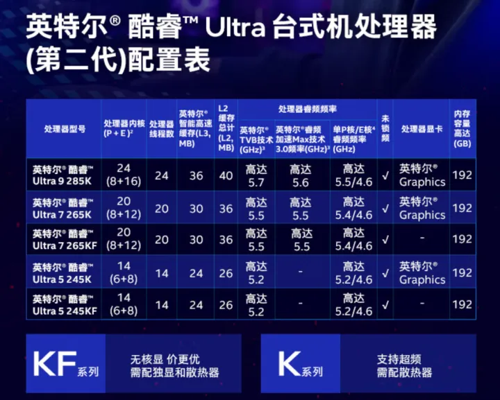今晚11点,英特尔就将正式发布全新的酷睿Ultra 200K“Arrow Lake-S”系列桌面处理处罚器,首批将会带来五款处理处罚器。如今这五款处理处罚器均已在国内平台上架,售价也随之公布,将于今晚23时开启预约,10月24日23时正式开售。 五款处理处罚器对比上一代、也就是第14代酷睿处理处罚器的同定位产物都有差别水平地贬价,具体价格如下: Ultra 9 285K - 4799元 | i9-14900K - 4999元 Ultra 7 265K - 3299元 | i7-14700K - 3499元 Ultra 7 265KF - 3149元 | i7-14700KF - 3299元 Ultra 5 245K - 2549元 | i5-14600K - 2599元 Ultra 5 245KF - 2399元 | i5-14600KF - 2499元 新一代处理处罚器的P-Core和E-Core分别升级至新的Lion Cove和Skymont架构,不再支持超线程技能和DDR4内存,将搭配800系列芯片组,支持DDR5-6400内存,启用新的LGA 1851插座,代替现有的LGA 1700插座。别的,核显利用了基于Alchemist的Xe-LPG架构。五款处理处罚器的具体规格见上图。晚些解禁后我们也会为各人带来更加具体的分析。 |