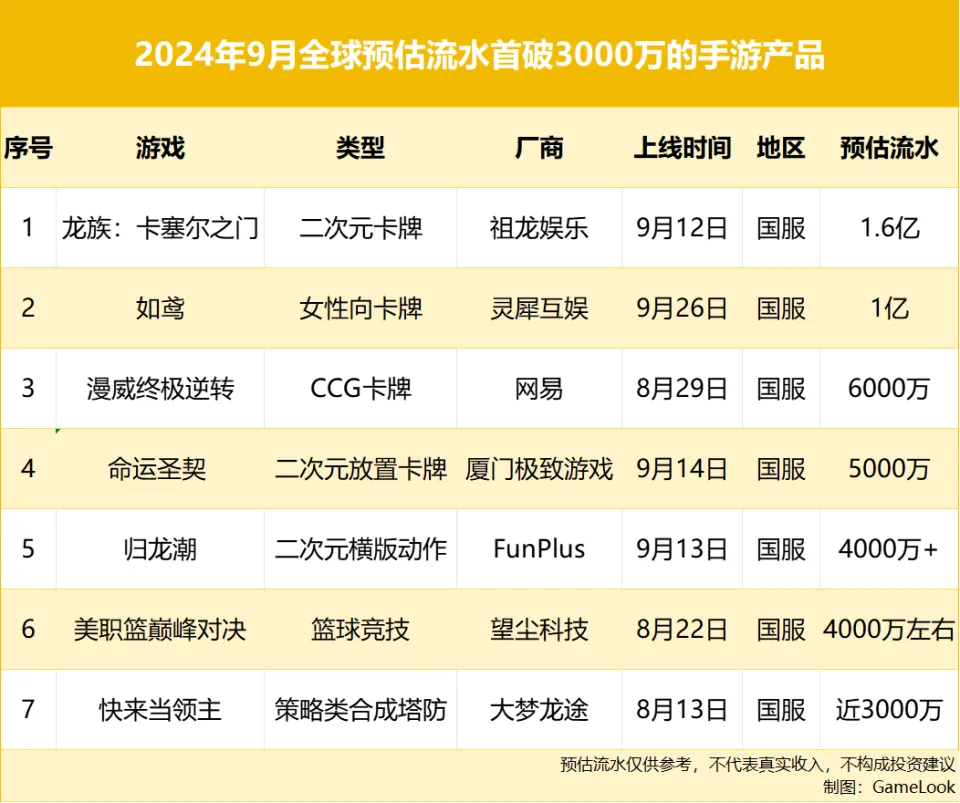 竣事了热闹非凡的暑期档后,本以为国内厂商将会短暂鸣金收兵,但没想到,9月手游市场反而被中国公司“包场”。 10月初,GameLook照例综合多个三方平台数据统计,发现今年9月环球范围内共有7款手游的预估月流水首次突破3000万元,且均为国内发行产品。令人意外的是,外洋市场发行新产品、和国外游戏公司集体缺席本次“3000万俱乐部”统计名单。 都说国内市场难做,纵然在降温的9月,仍不乏首月成功出线的玩家。被寄予厚望的外洋市场,反而没能撑起新游收入规模,实际多少有些戏剧性。 9月表现最亮眼的几款游戏分别是:祖龙《龙族:卡塞尔之门》、灵犀互娱《如鸢》、网易代理的《漫威终极逆转》、厦门极致游戏《运气圣契》、FunPlus《归龙潮》、望尘科技《美职篮顶峰对决》、大梦龙途《快来当领主》。 从结果来看,本月新游阵容的二次元浓度不低,中秋节期间同时跑出了三款二次元新游。此中,祖龙靠着二次元化包装的IP手游《龙族:卡塞尔之门》狂揽1.6亿预估收入,在9月24款新游猛烈竞争中跑赢“决赛圈”,拔得头筹。 但相比团体回落力度较大的二游,女性向游戏今年以来团体走势妥当。客岁暑期档因新游供应不足一度出现下滑,自年初《恋与深空》《世界之外》等游戏上线且发挥稳固,《恋与深空》更是突破品类收入记载,动员整个大盘一连上涨、节节攀升。 现在,随着灵犀互娱首款女性向游戏《如鸢》参加,并取得首月5天流水过亿的优异结果,意味着女性向赛道彻底进化为佳构化产品之争,未来非大厂或拥有肯定研发气力的厂商不得入内,成为手游市场亟待器重的增长洼地。 以下为GameLook盘货的9月流水首破3000万的游戏产品名单: 祖龙娱乐《龙族:卡塞尔之门》 9月(纳入统计19天)国服预估流水1.6亿 《龙族:卡塞尔之门》的成功相适时人意外,现在能突入iOS脱销榜第8的IP改编游戏已经不多了,更别说直接登顶9月新手游收入榜第一。而根据DataEye研究院预估,该游戏9月份在买量投流投入约在1亿-1.5亿元。 游戏自己玩法是通例的回合制战斗,美术质量更是中规中矩,在当前的二游圈子中谈不上多凸出,可以看出团体制作投入并没有超纲。可以说,《龙族:卡塞尔之门》的成功很大部门归功于《龙族》原IP的巨大影响力,以及祖龙务实的研发发行策略。 作为祖龙的第二款龙族IP游戏,深入明白粉丝需求后,他们敏锐地察觉到粉丝对书中角色的意难平,在制作和宣发投入上多以“还原”为主,并大打“温情牌”,将“角色+剧情”作为研发、运营的重点。 但囿于二游大盘的萎靡,以及行业通例卡牌游戏首发买量周期多半在1个月左右,在营销攻势减弱后,游戏进入10月后iOS脱销榜排名已下滑至20名左右。从《龙族:卡塞尔之门》到之前的《以闪亮之名》,祖龙在善于的MMO、SLG赛道外取得二连胜,阐明哪怕未曾涉猎过二次元、女性向赛道的厂商,也有机遇做好它们。 灵犀互娱《如鸢》 9月(纳入统计5天)国服预估流水1亿 固然国服刚刚推出,但其实,《如鸢》早就在女性玩家圈子中拥有相当高的着名度,相干角色、剧情切片早早火爆出圈,播放量破亿。开放预约不到两个月,官网预约数敏捷超过1500万。9月上线后仅5天,国服预估流水突破1亿大关。 值得一提的是,9月女性向赛道团体表现喜人,9月23日《恋与深空》新版本直接突破收入记载、首次登顶国服iOS游戏脱销榜和总榜。随着《如鸢》高调入局,意味着女性向游戏今年完成了新一轮的产品迭代更新。 无论叠纸、网易、祖龙、腾讯、米哈游还是灵犀互娱,女性向赛道已经围满了大厂和有肯定研发气力的厂商。满是佳构,没有一个“杂牌军”。成功率也相当高,险些是一上一个成功。唯一惋惜的是赛道宿将友爱韶光,但其将旗下产品转战小游戏重新发行后,也取得了肯定结果 相比袒露不少题目的二游,女性向游戏难过保持妥当发展态势。部门缘故因由在于二游转向多平台,移动端收入不可避免被分走一部门。相反,女性用户广泛风俗于手游体验,女性向品类的手游收入也能保持稳固。 更为本质的缘故因由在于,二游的玩法创新和产品形态升级已经见顶,入场者层出不穷,机遇却在一连锐减,致使整个品类颓势尽显。反观女性向游戏,战斗要素才刚刚随《恋与深空》《如鸢》等引入,无论技能形态还是玩法迭代,都另有很大的空间。同时整个品类数目有限,质量却能保持在高位,直接动员大盘扩张。 现在能看到的,女性向游戏下一轮升级是开放世界多平台游戏《无穷暖暖》。游戏环球预约用户已经突破2000万,并于近期开启新一轮测试。App Store显示游戏将于2024年12月31日上线,意味着很大概在年底发布,届时整个品类大概还要出现一轮爆发。 网易代理《漫威终极逆转》 9月(纳入统计30天)国服预估流水6000万 作为网易早早投资的工作室的产品,由前《炉石传说》总监Ben Brode成立的工作室Second Dinner研发的《漫威终极逆转》,可以说是已往两年外洋市场最大的爆款之一。 2022年10月上线后,半年内游戏累计收入突破5000万美元、首年流水超12亿元。并一度登顶环球日下载榜首位,深受西欧玩家的青睐。之后更是直接拿下当年的TGA年度手游大奖,实现口碑票房的双丰收。 固然有明星制作人与世界顶级IP的加持,但随着近期《炉石传说》国服回归,卷走了大部门CCG游戏玩家,网易代理的国服表现只能说是中规中矩。当然,漫威究竟在国内拥有相当大体