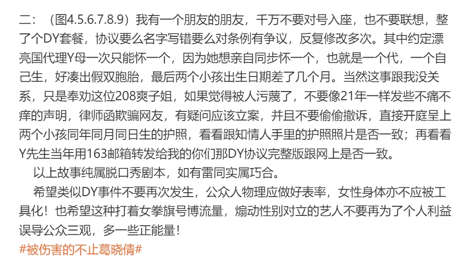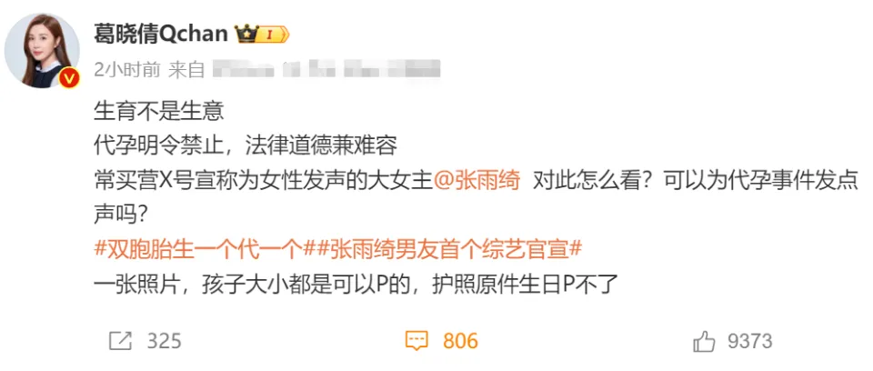 葛晓倩又出来爆料张雨绮了。 继爆料张雨绮插足她和袁巴元的感情之后,葛晓倩又发长文以“我有一个朋侪”的语气爆料,长文中直指张雨绮的一对龙凤胎此中一个孩子是代孕的,她自己只生了一个孩子。 葛晓倩的爆料里写得很详细,说张雨绮的一对龙凤胎中,只有一个孩子是她生的,另一个是在美国找人代孕的,两个孩子出生年代相差几个月。 葛晓倩还表现自己手上有可以证明两个孩子不是同一天出生的证据,不外由于平台无法发隐私照片以是没发,身边有很多人手上都有这些资料。 葛晓倩也提到,之前就是由于张雨绮发过自己的大肚照片,以是大家才信任了她和代孕没有关系。 她隔空喊话张雨绮,渴望张雨绮如果以为被造谣了就拿出有力的证据,比如晒出两个孩子的护照证明是出生年代是雷同的,而不是发发无关紧急的声明。葛晓倩也提到了一点,网上关于龙凤胎照片的巨细是可以修图的,但护照就不可以。 不外目前为止,张雨绮方还没有出面回应葛晓倩的爆料,关于这个“代孕瓜”尚有待讲求。 不外由于葛晓倩这次的爆料,关于张雨绮的“代孕风波”再次被提及,实在这已经不是她第一次陷入代孕风波了。 21年的时间,由于某位女星的关系,网上关于张雨绮疑似代孕的传闻一度传得沸沸扬扬,乃至网上传出了张雨绮和袁巴元在国外的所谓代孕条约。 其时尚有爆料说,张雨绮之以是和袁巴元闪婚没多久就发急找代孕生一个孩子,自己又生了一个孩子,是由于她想凭借孩子多分点袁巴元的财产。 由于张雨绮和袁巴元完婚没多久,有传袁巴元的公司要挂牌了,能拿到10亿元,张雨绮如果在公司挂牌前和袁巴元领证生子就能分到更多的钱。 当然,在2021年的时间,网上关于张雨绮代孕的种种传闻实在已经被张雨绮和她的工作团队否认了,还发了辟谣声明。 当年张雨绮生下龙凤胎时,杨机动也曾发过龙凤胎的照片,从照片来看,两个孩子确实是一样大的。 代孕风波时,杨机动还发过张雨绮的孕期照片,那张照片就能清楚看到,张雨绮确实是大着肚子的。 之后又有网友扒出张雨绮在国外大着肚子被拍到的照片,固然不是很清楚,但能看出她是怀孕状态。 前不久尚有媒体拍到张雨绮和新男友带着两个孩子外出约会,从孩子的身高来看,确实是差不多的。 而且张雨绮在节目上也有分享过两个孩子的变乱,她曾说实在怀孕还是蛮辛劳的,其他的还好。 也说过自己有一段时间在生孩子。 还在节目上分享,目前自己唯一的软肋就是两个孩子,不想两个孩子由于妈妈在网上的各种欠好传闻受到影响。 以是还是有很多网友不信任葛晓倩的爆料的,不外本相毕竟怎样,渴望张雨绮后面能回应吧。 |