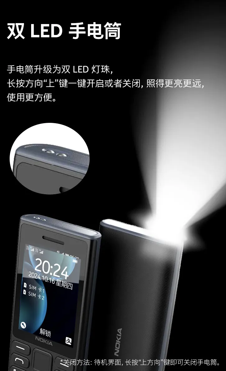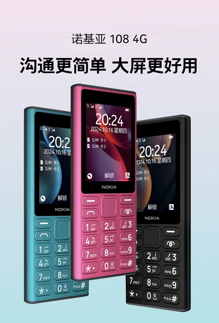 IT之家 10 月 12 日消息,HMD Global今天在京东上架了2024款诺基亚108 4G功能机,该机主打“大屏语音播报、USB-C 接口”,可选黑 / 蓝 / 粉三色,售价为 259元。 该功能机九宫格键盘处取消了诺基亚Pure字体,背部无摄像头,不外配备了LED手电筒和USB-C接口(IT之家注:充电功率2.75W),同时支持蓝牙5.0技能。 该机搭载2.4英寸屏幕,内置1450毫安时电池,支持全网通 4G VoLTE通信,内置付出宝、喜马拉雅、咪咕音乐应用。 |