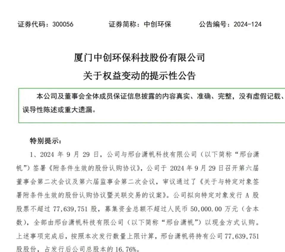 中创环保已连续3年亏损。 作者丨姚悦 编辑丨武丽娟 泉源 | 野马财经 中创环保(300056.SZ)等来了“AI大佬”。 日前,中创环保公布公司订定增募资不凌驾5亿元,这将引发公司实控人变动。拟变动的实控人为胡郁。 胡郁不光是人工智能范畴的资深专家,担当科技部“863类人智能重点项目”首席专家,也是科大讯飞(002230.SZ)团结首创人,曾任科大讯飞轮值总裁等职务。当前,其担当董事长、总司理的安徽聆思智能科技有限公司(下称:聆思科技),实控人也是科大讯飞的实控人。 中创环保是国内第一家高温袋式过滤除尘上市企业,产物紧张针对高温工业范畴粉尘治理标题。在履历长达4年的股权争斗之后,中创环保元气大伤,第二任实控人入主之后,刚公布转型锂电质料又遭遇行业产能过剩。进入2024年以来,公司又先后履历转型AI以及无实控人状态。与此同时,中创环保已连续3年亏损。 泉源:野马财经 定增5亿“补血”,实控权即将“易主”遭遇红利挑衅的中创环保等来的“大金主”,同时也是“新舵主”。 10月8日,中创环保发布公告称,公司筹划向邢台潇帆科技有限公司(下称:邢台潇帆)发行不凌驾7763.98万股,募集资金总额不凌驾5亿元。 泉源:中创环保公告 当前,中创环保正遭遇红利挑衅。据公告表现,2023年度及2024年1-6月,中创环保谋划活动现金流分别为-5035.35万元、-1.07亿元;别的,2021年至2024年1-6月,公司财政费用分别为1673.06万元、2172.46万元、2375.07万元,以及699.56万元。 中创环保表现,此次不凌驾5亿元的募集资金,扣除发行费用后将用于增补活动资金和归还银行贷款。此次募资将低落公司财政费用,提拔公司资金活动性等。 中创环保的“大金主”也将成为公司的“新舵主”。据公告表现,中创环保此次定增将引发公司实控人变动。 邢台潇帆此前没有持有中创环保的股份,在定增完成后,按照此次发行数量上限盘算,邢台潇帆持有股份将占发行后公司总股本的16.76%,成为上市公司控股股东。邢台潇帆实控人胡郁将成为中创环保的实控人。 日前,中创环保对投资者表现,发行股份还须要走一系列的干系步调,按照市场广泛情况来看,公司实控人正式变动,还须要数月之久。 据公告表现,邢台潇帆创建于2024年9月24日,注册资源为5亿元,是专为此次股票发行而设立,其业务涵盖人工智能底子资源与技术平台、智能控制体系集成、集成电路芯片计划等范畴。 邢台潇帆由邢台荣来觅斯科技有限公司(下称:邢台荣来)和邢台康启科技有限公司(下称:邢台康启)直接持股,持股比例分别为52%、48%。其中,邢台荣来由胡郁直接持股99%,王海直接持股1%;邢台康启由张智辉通过清河县盛世房地产开发有限公司间接全资持股。胡郁为邢台潇帆的实控人。 泉源:中创环保公告 值得一提的是,以中创环保10月11日收盘价13.3元/股来算,此次订定的认购代价6.44元/股,算是打了4.8折。按照此次发行数量上限盘算,潇帆科技5亿元投资金额,目前已代价约10.33亿元,浮盈约106.6%。 “准掌舵人”是“AI大佬”与上市公司中创环保相比,其“准掌舵人”胡郁的说明更为显赫。 胡郁不光是人工智能范畴的资深专家,也有着深厚的科大讯飞配景。胡郁即将入主中创环保的消息一出,在公司股吧里,不少投资者表现“等来了大佬”。 资料表现,胡郁出生于1978年5月,担当科技部“863类人智能重点项目”首席专家,也是科大讯飞团结首创人。1999年科大讯飞创立之初,胡郁就参加了其时仅18人的创业团队。自1999年至2021年,胡郁在科大讯飞担当多个紧张职务,包罗底子研发部总司理、研究院实验院长、高级副总裁,以及轮值总裁和实验总裁。 2021年,因打造更完备人工智能财产生态的须要,科大讯飞两位高管公布辞任,转身入职科大讯飞AI芯片财产链上的公司。两位高管其中之一就是时任科大讯飞董事、副总裁的胡郁。 离开科大讯飞,胡郁出任了聆思科技的董事长兼总司理。创建于2020年的聆思科技,是讯飞“云端芯”战略中芯片环节的紧张互助伙伴,专注于研发人工智能芯片及办理方案。据IT桔子数据表现,该公司已于2024年1月完成A+轮融资。 别的,目前,胡郁还在上海聆芯科技有限公司、湖南芒果听见科技有限公司、华南脑控(广东)智能科技有限公司、安徽讯飞至悦科技有限公司等17家公司担当高管;以及深圳市达晨创联股权投资基金合资企业(有限合资)、安徽讯飞创业投资合资企业(有限合资)等35家公司担当股东。这些公司绝大多数都是与科技财产干系。 泉源:天眼查 而胡郁此次看中的中创环保,是国内第一家高温袋式过滤除尘上市企业,目前主业以有色金属质料、过滤质料和情况治理(烟气治理工程、危废处置惩罚、城乡环卫一体化、污水处置惩罚)三大业务板块为主。固然中创环保已经公布转型AI,但日前,有公司方面人士对投资者表现,当前公司AI业务还处于起步探索的阶段。 “AI大佬”为何跨界环保? “环保财产是政策关注的焦点,也是具有技术创新潜力的范畴,特别是AI与环保的联合目前还是新兴市场。”香颂资源董事沈萌表现。 值得注意的是,8月11日,中共中心、国务院下发了《关于加速经济社会发展全面绿色转型的意见》,明确提出在加速经济社会发展全面绿色转型的过程中,要大力推动传统财产绿色低碳改造升级,到2030年,重点范畴绿色转型取得积极进展。中创环保也在公告中夸大了这一政策配景,将为环保行业快速发展