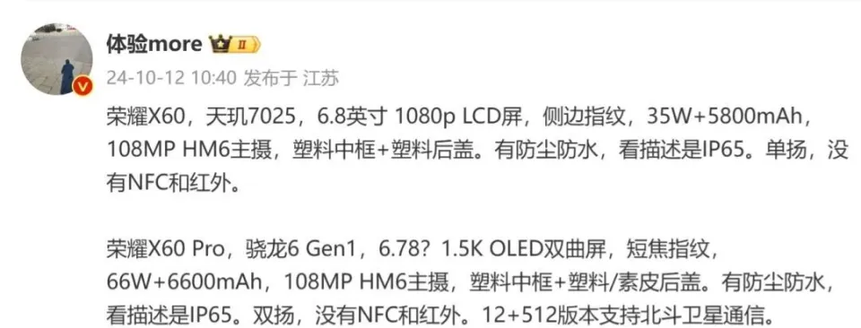 光彩 X60 系列手机将于 10 月 16 日 19:30 发布,博主 @体验more 本日透露了该系列手机的大部分设置信息。 官方已经公布了光彩 X60 系列手机的外貌,两款机型均采取居中挖孔摄像头筹划,尺度版为单挖孔、Pro 款则为“药丸”挖孔;X60 尺度版为直屏、Pro 款为曲屏。 除此之外,光彩今天对系列手机举行预热,新机号称“防水新峰”,可实现“12 小时淋雨无忧、360 度放心水洗”。(来源:IT之家)