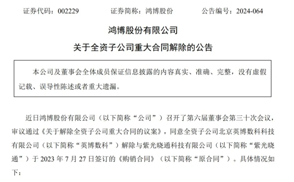 ”妖股”的故事是实是虚? 作者 | 李非林 张凯旌 编辑丨武丽娟 来源 | 野马财经 “AI算力牛股”鸿博股份(002229.SZ)的AI算力相关条约照旧出现了“变数”。 10月11日晚间,鸿博股份公告称,因宏观环境变革,全资子公司北京英博数科科技有限公司(简称“英博数科”)与紫光晓通科技有限公司(简称“紫光晓通”)清除了购销条约。 图源:公告 该条约涉及交易金额4.94亿元,款项用于英博数科向紫光晓通采购AI创新赋能中心所需的部分设备。目前已付出条约款3470.29万元,鸿博股份体现,预付款中部分已抵扣与紫光晓通其他设备采购款,部分继承抵扣或退回。 紫光晓通从属紫光股份(000938.SZ)旗下。天眼查体现,紫光股份通过紫光数码间接持有紫光晓通60%股权,其主要负责网络产物、软件和增值服务等项目的中国区业务。2022年10月,紫光晓通与英伟达签订代理协议,紫光数码正式成为英伟达数据中心GPU、DGX体系等产物的中国区总代理。 不止紫光晓通,英博数科还相继与北京京能、百川智能签订了AI算力大单,然而相关订单的推行环境都不及预计,本年6月相关希望还被厚交所问询。 本年以来,鸿博股份的发展不停不太顺遂,先是2月份控股股东持股被司法扣划,鸿博股份也因此变动为无控股股东,4月鸿博股份又解聘了算力业务“关键人物”周韡韡。 周韡韡2022年8月进入英博数科,此前在“36氪”任职高级副总裁,曾负责与英伟达方沟通多个地域创新赋能中心落地相助的可行性与北京AI创新赋能中心相助的商务谈判。2022年鸿博股份跟英伟达签订相助协议,不少媒体推测,这中间少不了周韡韡地“牵线搭桥”。 据“新浪科技”报道,周韡韡被解聘后,英博数科多位高管也相继被解聘。 与此同时,此前鸿博股份拟出资3亿元建立并交由英博数科独立运营的“AI赋能中心”,也因高层人事的剧变迎来变数:目前,加入“AI赋能中心”筹建的中恒文化也与鸿博股份解约。 而在公司接连发生变动后,10月11日,鸿博股份报收10.51元/股,总市值52亿元,不到一年时间,股价就较顶峰时期缩水超7成。 4.94亿元的采购条约黄了鸿博股份主营彩票印刷行业,一度是市场中的着名妖股。英博数科建立于2022年6月,是此前被市场热议的“英伟达概念”公司。 2022年8月,鸿博股份公布与英伟达相助建立了北京AI创新赋能中心,正式向AI范畴跨界。而英博数科,可以视为鸿博股份与英伟达相助的直接平台。 2023 年 7 月 27 日,英博数科与紫光晓通签订了该笔4.94亿元的《购销条约》,这也是鸿博股份决定跨界算力租赁业务以来签订的规模最大的采购订单,该笔订单也曾让二级市场对该公司能乐成跨级算力产生不小的信心。 但是该笔订单的推行却并不及预期。 鸿博股份体现,自条约签订起,英博数科与紫光晓通始终致力于推进原条约的实验,并与紫光晓通建立了精良的相助关系。但是该条约却迟迟没开始推行。 此次,鸿博股份选择与紫光晓通解约,给出的来由是宏观环境变革。 图源:罐头图库 不外,6月7日,鸿博股份复兴厚交所问询函时,曾阐明过该条约没有希望的具体缘故原由:主要因2023年10月美国商务部发布对华高端芯片的限定政策,导致国内算力设备紧缺,外部环境较条约签订时发生较大变革,该不可抗力导致紫光晓通未能按期推行本条约。 此前,鸿博股份已经付出了紫光晓通3470.29万元货款,此中2098万元抵扣掉与紫光晓通其他设备的采购款项,而且已经收到了相关设备。 别的尚有1372.29万元货款,此中1000万已经抵扣了其他设备采购款,剩余部分继承抵扣大概协商退回。 谈及解约给公司造成的影响,鸿博股份称,之前预备在紫光晓通采购的算力服务器及配套设备,如今已通过第三方采购到位了,不影响公司正常业务的开展,公司不涉及违约,也不会对财政状态产生倒霉影响。 对于此消息,投资者说法不一。股吧有网友称,“至少3个跌停预备”,也有网友称“中性的,最少有第三方渠道”。 图源:股吧 尚有13.82亿元大订单,履约进度为0%除了与紫光晓通的采购条约,鸿博股份2023年12月4日披露的近14亿元贩卖大订单则更受市场关注。 根据披暴露的协议内容,英博数科将向百川智能提供肯定规模的英伟达智算服务器全部算力和资源,涉及金额预计13.82亿元,推行限期为2024年1月30日开始的三年。 但直到6月7日鸿博股份复兴厚交所问询时,该条约的履约进度仍为0%。 对此,鸿博股份表明称,现阶段国内缺少对大规模英伟达GPU服务器集群的可参考调试先例,英博数科技术职员可参考相关技术路径较少,造成服务器到达满足性能要求状态较筹划有所延后。 百川智能的首创人是前搜狗CEO王小川,是发愤要做“中国版Open AI”的老板。客岁10月,百川智能完成一笔3亿美元的融资,目前股东中站着阿里、腾讯、小米等多家科技巨头。 英伟达在人工智能界的地位近乎把持,如今的市值高达1.9万亿美元。国内大厂抢破头皮也要买的正是英伟达的芯片。 来源:罐头图库 而鸿博股份,在与英伟达相助前,曾先后实验跨界转型大数据、手游、5G、区块链、小家电等范畴,但都没乐成,营收在迩来十年间不停原地踏步。结果跨界AI行业的第一步,就傍上了英伟达,未免显得有些“不真实”。 事实上,鸿博股份也确实因此受到了投资者的质疑。 职员上,2022年鸿博股份的研发职员中只有2名硕士,被解聘的周韡韡,其此前履历主要集中在媒体和品牌方面,与“卷履历”、“卷学