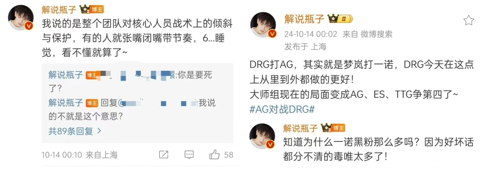 KPL年度总决赛的擂台赛阶段,AG超玩会遭遇到了DRG战队,本以为这场比赛AG超玩会可以赢得轻轻松松,却没想4局比赛都被碾压,直接1-3比分输给对手。这也是AG超玩会这一轮擂台赛的第2场失利了,大概率要和TTG、eStarPro一起抢夺第4的名额,假如后续体现再不好的话,大概就要去打暴虐的淘汰赛了! AG超玩会1-3不敌DRG,发育路一诺受到压抑看完比赛的小搭档应该都有一个雷同的感受,那就是一诺的发育路打得很难受,全场比赛都被压抑,就连轩染赛后采访中都明白表现,发育路几乎不停都在“下狱”,很难发挥出来。 第一局交手,AG超玩会这边是一诺后羿打敖隐,按理说应该好打一些,但DRG不停围绕发育路,卡着不让一诺发育,要不是后期DRG送了几波,AG是很难赢下首局的。 第二局比赛,DRG拿出了鲁班七号和鲁班大家,AG虽然想尽各种办法去切梦岚的鲁班七号,但始终无法靠近,好不轻易有了一次时机,又被手感极热的梦岚化解,还送了一波“三杀”,至此鲁班七号无人能挡。第3局比赛,梦岚的孙尚香在辅助明世隐帮助下,发育速率极快,才12分钟左右就一万多经济了,输出爆炸,又很快掌控全局! 末了的赛点局,AG超玩会不得不换上替补阵容,那就更不消多说什么了,很快就输掉了比赛。赛后许多解说都点评了这场对决,以为AG超玩会打法上有些题目,一诺的发育路很难受,无论是BP、照旧全队打法风格上,都不太在意发育路,乃职苄些时间连兵线都无法全部拿到,导致了比赛的惨败! 解说瓶子和一诺粉丝起辩论,家人受连累比赛结束之后,解说瓶子发文“DRG打AG,着实就是梦岚打一诺,DRG本日在这个点上从里到外都做得很好!大家组如今的局面变成AG、ES、TTG争第四了”。 瓶子这些话受到了不少一诺粉丝们的吐槽,一些激进粉丝以致直接唾骂瓶子的家人,这也让瓶子直接发作,和这些粉丝硬刚起来,他表现本身说的是整个团队对核心职员战术上的倾斜和掩护,有些人张嘴闭嘴就带节奏,末了瓶子还怒怼这些玩家“直到为什么一诺黑粉多吗,由于优劣话都分不清的毒唯太多了”。 瓶子本意是想客观分析比赛,分析AG惨败的缘故原由,就是没能像DRG那样围绕发育路打出来,而不是一诺个人体现差。但是一些激进粉丝在看到他说发育路以及一诺的“不好言论”之后照旧忍不住和瓶子硬刚起来,才导致了这些闹剧,各位小搭档,你们对此有什么见解呢? |