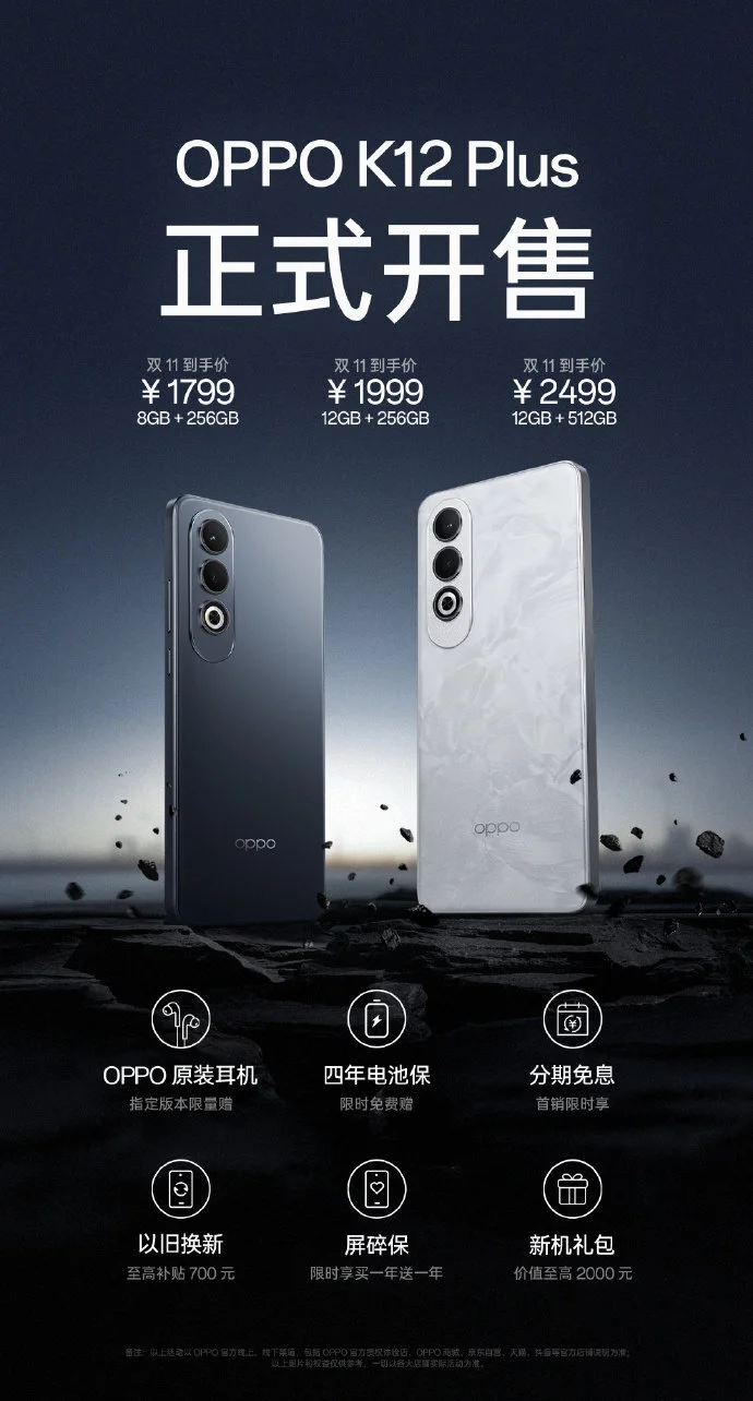 10 月 15 日消息,OPPO K12 Plus 全渠道开售,这款新品拥有 OPPO 史上最大电池,玩游戏也能稳固发挥。 OPPO K12 Plus 拥有「雪峰白」和「玄武黑」两款配色,前者的后盖采取晶钻纹闪光砂工艺,带来独一无二的纹理计划,后者则非常深邃沉稳,在光线下折射出浅蓝色的光芒,同样质感满满。 续航上,OPPO K12 Plus 配备 6400mAh 超大电池,官方表示可以连续畅玩 11.21 小时的 MOBA 游戏。充电上配备长寿版 80W 超等闪充,充电 20 分钟即可充入一半电量,告别续航焦虑。 性能方面,OPPO K12 Plus 搭载第三代骁龙7 移动平台,采取台积电 4nm 制程工艺,继续了第二代骁龙8 的核心架构。强大的性能共同最高 12GB+512GB 的超大内存组合,应用启动速率再提拔。 OPPO K12 Plus 双 11 得手价 1799 元起,假如你也必要一款超长续航的手机,OPPO K12 Plus 就是一个不错的选择。 |
