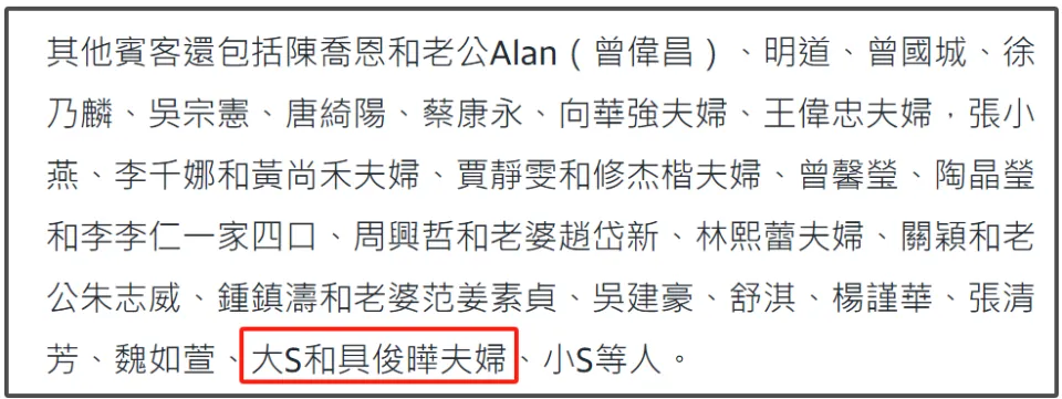 萧敬腾和林有慧完婚请了泰半个台娱圈,场面非常热闹,曾经见证过两人恋情的小S也带老公许雅钧出席,但却一直没见到萧敬腾好友大S的身影。过细想想,大S得有快半年的时间没公开露面了吧? 萧敬腾的婚礼非常豪华,在台娱也堪称世纪婚礼,陈乔恩夫妇、蔡康永、明道、王伟忠夫妇等台娱界大咖全都去了婚宴,小S也受邀出席,还亲身上台唱《舞女》娱乐各人并庆贺新人,看着活力四射。 但这么大的场合,和萧敬腾是好友的大S却没有露面,固然台媒报道宾客名单的时间有她和具俊晔的名字,但全网路透也不见她的身影,好像是缺席了好友的婚礼。萧敬腾好友周杰伦也没有出席,萧敬腾还表明说本身的请柬发得晚,有的朋侪档期排不开,就没来,但是大S应该没有档期困扰吧?她从再婚之后就一直待在家里啊。 前次公开露面照旧具俊晔5月份个人DJ秀之后,她陪着老公招待从韩国来的朋侪们,各人发出了合照,具俊晔也久违地晒老婆秀恩爱,这才让各人看到大S的状态。 当时大S已经初显苍老,笑起来脸僵尚有法令纹,不外身材倒是很纤瘦,但也被眼尖的网友发现有P图陈迹,配景的墙都是歪的。 果然两个月后,大S被人在韩国偶遇就现了本相。当时正值暑假,大S大概是陪具俊晔回韩国,刚好又可以带孩子旅游,然后就被路人偶遇并拍下了照片。 大S当时的穿着打扮很日常,站在街边玩手机,乍一看比之前更加显老,身材也没有很良好,站在那里还没什么精气神,老了很多,搞得网友都不敢认。 假如不算网友偶遇,从5月份好友聚餐到现在,大S已经有近半年的时间没有公开露面了。还记得年初3月份的时间大S到场小S公公的葬礼,就被网友发现她有白发。以后也是很久不露面。 网友发现大S每次公开露面之后都会有很长一段时间不会再露面,不知道是不想被各人讨论状态,照旧真像汪小菲说的那样,她出不了门。 再联合汪小菲控诉大S长期滥用药物,严重时会疯癫打人,令人感叹不已。 小S也在节目里爆料大S上厕所都要具俊晔抱,听起来好像两人新婚很恩爱。而具俊晔却说大S很衰弱,不能走太多路,听起来大S的身材状态并不是很好。 而迩来大S不但没有出席像萧敬腾婚礼这种公开场合,连外甥生日的视频里都不见她的身影。萧敬腾婚礼前夕正是大S外甥的生日,小S晒出了她在外甥生日会上舞蹈的视频,具俊晔还出镜和小S互动,逗弄小S的头发,画面非常有爱,但大S却没有出现在镜头里。 这几年妹妹小S仍旧很喜好分享日常生存,母亲生日、外甥生日都会晒照晒视频,而大S一次都没分享过,也没露过面,和以往总在微博上和粉丝分享生存互动的举动大相径庭。 不少粉丝也都担心她的身材状态,就盼望她不露面是由于不想再业务混圈,而不是有什么别的身材缘故因由吧。 本文未经授权严禁转载违者必究! |
