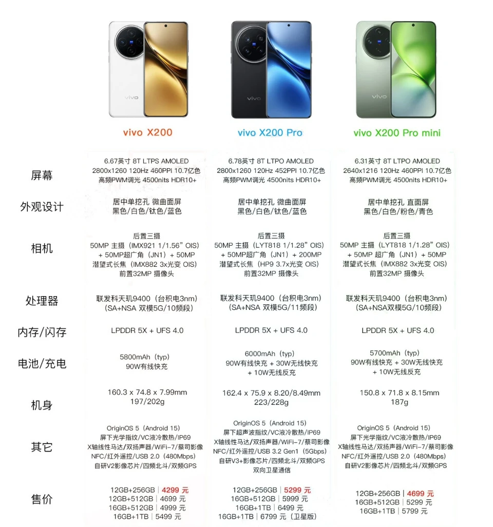 vivo X200系列发布了,这个系列上市,意味着2024年下半年的手机圈,竞争变得更加剧烈了,究竟和上代机型相比,发布时间险些提前了一个月,vivo 之以是选择在这个时间点上市,本质上就是为了给双十一冲一波销量。那么标题来了。 vivo X200系列值得买吗?三款手机都有哪些升级和区别,三款手机该怎么选呢? 起首可以明确的是,作为举世首发天玑9400芯片的手机,vivo X200系列的性能无疑是如今安卓阵营第一梯队,官方公布的安兔兔跑分可达300万,出色的性能,足以轻松应对生存中的各种应用场景。带来相对来流通的感觉,而且全系都是天玑9400芯片,确实很专心。 那么,vivo X200/Pro/Pro Mini有什么区别呢?三款手机该怎么选?对比之后就懂了。各人可以先自行检察三款手机的核心设置对比图。 参考以上对比图,我们发现,vivo X200系列的区别在以下这些方面。 一、屏幕和尺寸方面 vivo X200和vivo X200 Pro都接纳了等深微四曲面屏的筹划,vivo X200的屏幕尺寸是6.67英寸,X200 Pro则是6.78英寸,X200 Pro mini则是直屏的筹划,是6.31英寸的小屏。 只管屏幕尺寸和形态差别,但是屏幕素质都差不多,都是1.5K分辨率的OLED屏幕,都接纳了8T LTPO背光技能,都具备4500nit局部峰值亮度,具备高频PWM调光,画质体现险些是同一程度。 表面造型方面也同等,只不过vivo X200和X200 Pro的机身重量更重一些,vivo X200 Pro mini则比力偏重轻薄的手感。 二、影像方面 vivo X200由于代价更低一些,主摄方面相对来说有一定的阉割,使用的是比力普通的索尼IMX921主摄,和vivo S19 Pro是同款,具备1/1.56英寸感光面积。 而vivo X200 Pro和X200 Pro Mini则使用了更加高级的索尼LYT818主摄,具备1/1.28英寸大底。 三款手机的超广角镜头一样,都是三星JN1,像素5000万。 长焦镜头方面,则有明显的差距,vivo X200和X200 Pro mini一样,使用的是5000万像素索尼IMX882,最高支持3倍光学变焦,100倍数码变焦。 vivo X200 Pro则使用了X100 Ultra同款2亿像素的潜望长焦镜头,支持3.7倍光学变焦,支持长焦舞台灯光。 三、续航方面 三款手机也有明显的差别,vivo X200使用的是90W快充、5800mAh电池的组合,没有无线充电。 X200 Pro使用了6000mAh超大电池,90W快充,30W无线充电的组合,支持10W无线反向充电。 X200 Pro mini的充电功率和X200 Pro同等,不过电池容量缩水到了5700mAh。 四、别的 别的细节方面大同小异,机身都是铝合金,后盖都是玻璃大概素皮,都做到了IP68+IP69防水,都支持双频GPS,四频北斗,红外、NFC、立体双扬声器等功能。 只不过尺度版和Pro Mini机型使用都是短焦屏幕指纹,X200 Pro才是超薄屏幕指纹,顶配的X200 Pro才具备卫星通讯功能。 五、代价 vivo X200的起售价为4299元,X200 Pro mini起售价为4699元,X200 Pro起售价则是5299元,相比上代机型,都明显涨价了。 末了总结 综合对比来看,vivo X200系列全系都标配了天玑9400芯片,性能都是行业第一梯队,但是细节差别,vivo X200代价最低,主要是主摄有一定阉割,取消了无线充电,时间大部门喜欢大屏高端机的斲丧者入手。 vivo X200 Pro Mini是为小屏爱好者量身打造的产品,只管代价比X200更高,设置确更加专心,具备更好的主摄,尚有无线充电功能,是iPhone 16的有力竞争对手,恰当喜欢小屏高端机的朋侪入手。 vivo X200 Pro的是如今这个系列设置最高的机型,固然影像和X100 Ultra相比尚有一定的差距,但是下放了2亿潜望长焦镜头,使用了全新的天玑9400处理器,尚有更悦目标表面筹划,恰当对手机有照相专业需求的斲丧者入手。 各人对vivo X200系列怎么看呢? |