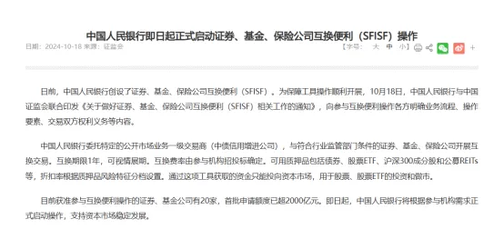 值得留意的是,此次开幕式上,央行行长潘功胜、国家金融监督管理总局局长李云泽、证监会主席吴清的发言多处介绍了本年9月24日国新办发布会内容的最新进展,尤其是证券基金保险公司交换便利、股票回购增持专项再贷款等相干钱币政策工具落地。论坛年会上,《关于设立股票回购增持再贷款有关事件的关照》《关于做好证券、基金、保险公司交换便利(SFISF)相干工作的关照》等有关细节文件发布。 据相识,央行与证监会、金融羁系总局组建了工作专班,证券、基金、保险公司交换便利已开始担当金融机构申请,现在获准到场交换便利操作的证券、基金公司有20家,首批申请额度已超2000亿元,克日起,央行将根据到场机构需求正式启动操作,支持资源市场稳固发展。吴清也在年会上体现,批复同意20家券商、基金公司申请央行交换便利。 尤为一提,本年金融街论坛年会主题为“信托和信心——共商金融开放相助共享经济稳固发展”,关键词在于“信”与“合”,这会合袒露在本次羁系部门的表述上。好比,吴清谈到,证监会将刚强不移连续推进市场、机构全方位制度型开放,拓宽境外上市渠道,鼓励外资机构来华投资展业。将进一步加强政策的稳固性、透明度和可预期性,积极让各类资金“乐意来、留得住、发展得好”。 团体来看,新“国九条”和资源市场1+N的政策体系以来,市场生态进一步好转,市场基础制度加速美满,市场功能保持根本发挥。可以看到,提振资源市场这条主线,强化责任继承,统筹防风险、强羁系、促发展,羁系部门多措并举,已有会合的几条工作“清单”。证监会也此前亮相,在投资端、资产端、中小投资者掩护等方面进一步策划并适时推出更多务实管用的政策步调。 吴清称,资源市场在金融运行中牵一发而动全身,在促进创新资源形成、助力产业转型升级、美满社会财产管理、稳固社会生理预期等方面发挥着独特而关键的作用。证监会将果断贯彻落实二十届三中全会和中心政治局集会精力,牢牢围绕资源市场高质量发展,强本强基、严监严管,防范风险,有用发挥资源市场功能,更好地服务经济社会发展大局。 看点一:SFISF细节公布、克日起实验 关于交换便利(SFISF)工具的创新性设立,市场颇为关注,也根据最新发布的《关于做好证券、基金、保险公司交换便利(SFISF)相干工作的关照》,一些详细细节得以确认: