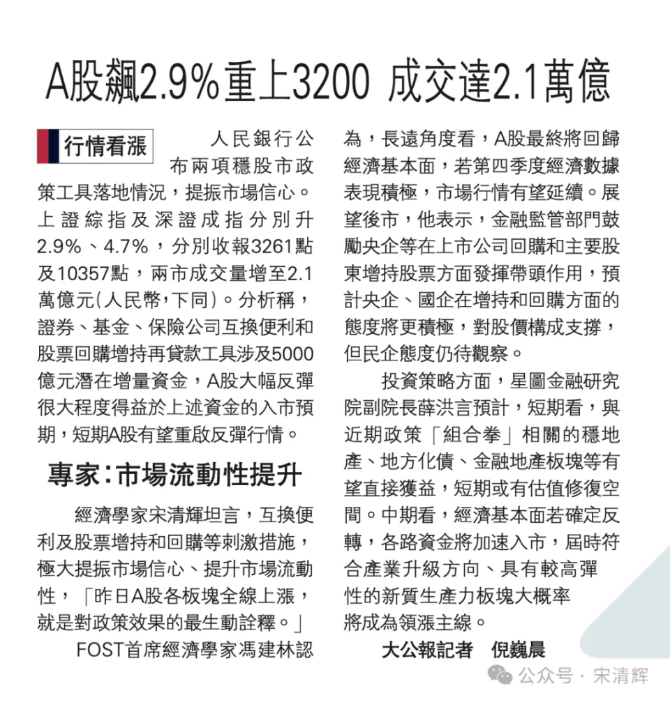 人民银行公布两项稳股市政策工具落地环境,提振市场信心。上证综指及深证成指分别升2.9%、4.7%,分别收报3261点及10357点,两市成交量增至2.1万亿元(人民币,下同)。分析称,证券、基金、保险公司交换便利和股票回购增持再贷款工具涉及5000亿元潜伏增量资金,A股大幅反弹很大水平得益于上述资金的入市预期,短期A股有望重启反弹行情。 专家:市场运动性提升 闻名经济学家宋清辉坦言,交换便利及股票增持和回购等刺激步调,极大提振市场信心、提升市场运动性,“昨日A股各板块全线上涨,就是对政策结果的最生动表明。” FOST首席经济学家冯建林以为,长远角度看,A股终极将回归经济根本面,若第四序度经济数据体现积极,市场行情有望连续。预测后市,他体现,金融羁系部门鼓励央企等在上市公司回购和紧张股东增持股票方面发挥带头作用,预计央企、国企在增持和回购方面的态度将更积极,对股价构成支持,但民企态度仍待观察。 投资战略方面,星图金融研究院副院长薛洪言预计,短期看,与近期政策“组合拳”相干的稳地产、地方化债、金融地产板块等有望直接获益,短期或有估值修复空间。中期看,经济根本面若确定反转,各路资金将加快入市,届时符合产业升级方向、具有较高弹性的新质生产力板块大概率将成为领涨主线。\大公报记者 倪巍晨 |