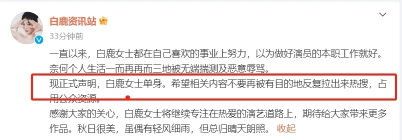 克日,有狗仔曝出白鹿、张凌赫曾同居的消息,一时间也是引发了网友的热媾和关注。 白鹿和张凌赫爱情的消息,早在《宁安如梦》还未开播的时候,就已经传了一阵。再到后续两人被曝出已分手,更是直接影响到了《宁安如梦》的播出远景。 但没想到,在各人早已将此事淡忘的时候,却是又再度被狗仔曝出两人曾经一度到了同居的地步,以致于说白鹿的父母都是知道两人恋情的。这样的消息若真的属实,那白鹿和张凌赫当时的感情无疑黑白常稳固的。 而在相干话题不停发酵,引发了网友种种意料事后,白鹿的资讯站在10月20日晚直接发布了所谓的“单身声明”往返应此事。 在声明中表现,白鹿现在正满身心的专注在工作之上,更是直接表明“单身”的状态!固然没有提及张凌赫,以及此番引发热议的同居话题,但相干的用词用语无疑是直接否认了与张凌赫恋情,更不消提所谓的同居了。 究竟上,在全部人都默认两人即便是在一起过,现在也已经是分手状态的情况下,此时曝出两人曾同居的消息,真的是除了“蹭热度”和“博眼球”以外,真的是没有任何的意义了! 毕竟明星也是人,在合适的年龄碰到合适的人,谈一场美美的爱情,更是再正常不外的事情。如果是此前两边都很明确的表现过从未在一起,那此时曝出曾同居的消息,大概还能影响到两人的路因缘和口碑。 但从一开始两人就没有对相干话题举行过正面回应,而且在已经已往这么久,相互都已经放下,专注于古迹上后,出来这样的爆料,也难怪会让白鹿方面直接发文辟谣了! 固然了,如果从嗑CP的角度来看,曾经在《宁安如梦》中合拍的两人,伴随着白鹿此番的否认,显然也是让曾经的“百年好合”组合彻底成为了已往,这大概也是一件让人有些遗憾的事情。 不外固然两人没能走到一起,但却是一同迎来了古迹新篇章。白鹿在《宁安如梦》后一口吻接拍了《临江仙》《白月梵星》等多部古装仙偶剧,再加上再度成为了《奔驰吧》的常驻高朋,以及各种大牌代言不停,现现在的白鹿已然是成为了同期小花中最耀眼的存在。 张凌赫固然依旧还顶着“待爆小生”的标签,但在与赵今麦互助出演了《度华年》,而且后续敏捷二搭主演了《樱桃琥珀》后,张凌赫同样是迎来了新的人气高峰。 因此,岂论曾经两人是否谈过爱情,又大概是否到了同居的程度,在两边选择分开后,就不应该再成为舆论的焦点。毕竟说一千道一万,这都是别人的私生存,理应得到恭敬。 对此,各人是怎么看呢?欢迎私信留言,我们一起交流! |