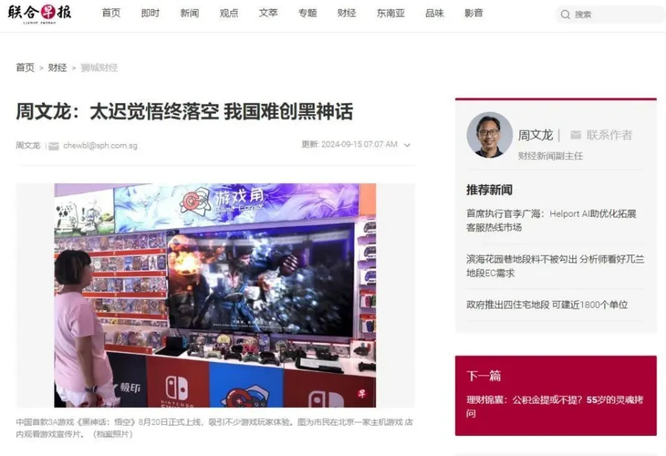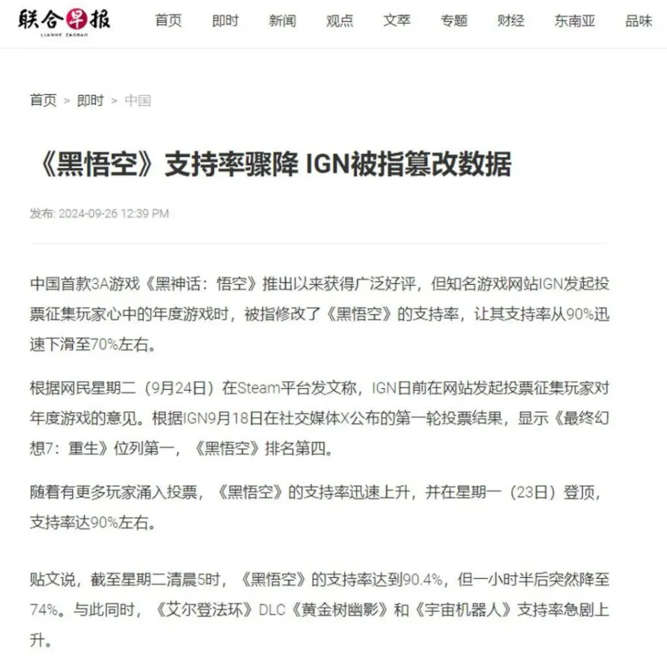 本年《黑神话:悟空》的爆火,不但仅是唤起了国内玩家血脉之中的文化认同感,更是在整个中华文化圈内都取得了空前热烈的反响。早在游戏正式上线之前,在Youtube上的游戏PV评论区就有不少越南、泰国玩家表现“悟空也是本身的童年追念”,因为很多东南亚国家,当年也引进了《西游记》电视剧,并深深影响了一代人。 而《黑神话:悟空》毫无疑问是将《西游记》与孙悟空这一文化符号,举行了现代化的再次演绎,因此它在中华文化圈内爆火完满是一件预料之内的事情,以致就连新加坡前总理、国务资政李显龙都亲身“为《黑神话·悟空》站台”。 10月18日,在新加坡举行的“慧眼中国环球论坛”上,李显龙表现玩《黑神话·悟空》,有助于新加坡的门生们相识中华文化,并且号令门生们去相识中华传统文化的内涵。 图源:Prime Minister’s Office, Singapore 李显龙:“如果你长大不知道谁是孙悟空,是有题目的” 本年5月,李显龙正式卸任新加坡总理,并且就职新加坡国务资政,而这次论坛上,主持人也是问李显龙,在退下来有了更多空闲时间之后,是否有接触过线上游戏。他用中文答复道,没怎么玩线上游戏,但是听说近来有一个游戏很红,那就是《黑神话:悟空》。 李显龙表现,《黑神话:悟空》是很高档次的游戏,他曾上网看相干视频,发现游戏主人公的动作很快、一招一式目不暇接。 “我看都看不清晰他做什么,他已经竣事了,以是如果我要做‘天命人’,去参加这个游戏,去跟这些妖怪妖怪斗的话,我看我没办法争回六根,完全没有渴望,以是最好让电脑游戏达人去做,我在这边一乾二净就好了。” 《黑神话:悟空》每个章节都会得到一个“根器” 而当主持人问道,如今很多新加坡的门生,学习中文很吃力,嬉戏《黑神话:悟空》这种游戏是否有资助,以及他是否会让本身的孙女玩这款游戏。 李显龙则是表现,孙女如今还小,还没有到玩电脑游戏的年事,到了这个年事,她肯定有爱好。至于《黑神话:悟空》对于学中文的作用,李显龙说道: “至于学华语,(玩《黑神话:悟空》)我想有它的作用,因为我们渴望孩子们学华语不但是学语言,而是也渴望他们能吸取中华文化、中华传统,相识中华传统非常丰富的文化内涵。以是像《西游记》这样的名著,如果你长大不知道谁是孙悟空,是有题目的,大概你长大不知道谁是诸葛亮、《三国演义》,那也是有题目。” 李显龙还进一步表明了,《黑神话:悟空》在新加坡门生们学习中文、相识中华传统文化的过程中,起到了一个桥梁的作用。 “如果你只背成语、整个成语辞书,(好比)什么三顾茅庐,什么司马昭之心,很没有意思,很枯燥无味的。你必须懂得这个故事,那些成语才会很清晰地在你的头脑里面。以是如果你可以玩《黑神话:悟空》之后,有爱好去看看《西游记》的影戏,大概以致读吴承恩的书,那是最好的。” “我渴望我们可以通过这些比力软的渠道,鼓励门生去不但是学习华语,同时是吸取一些中华文化的内涵。” 末了,李显龙也夸大,玩游戏固然也必须恰如其分,“到了时间就必须停了。” 《连合早报》发布高出50篇《黑神话:悟空》相干报道 毕竟上,不但仅是新加坡前总理李显龙以个人身份,对《黑神话:悟空》予以肯定,新加坡的一些权势巨子媒体也对《黑神话:悟空》表现了富足的支持。 就好比新加坡影响力最大的华文媒体之一的《连合早报》,就在《黑神话:悟空》上线之后的2个月内,通过《连合早报》网站累计发布了高出50篇相干的报道,他们给到《黑神话:悟空》的牌面以致高出了一些中国的主流媒体。 而《连合早报》文章内容也是方方面面,有提到游戏本身的市场表现的,有分析游戏在线下文旅、文化输出等诸多方面影响的,另有为《黑神话:悟空》遭遇西方媒体不公正对待而打行侠仗义的。 上个月IGN窜改《黑神话:悟空》投票数据事件 在Gamelook看来,新加坡上至国家总理,下至权势巨子媒体《连合早报》,对《黑神话:悟空》表现出云云积极的态度,实在都是难能难得的一件事。据Gamelook观察,我们的邻国日本、韩国,日韩游戏媒体对《黑神话:悟空》的报道都并不多,更遑论本田主流媒体。 这在某种程度上,照旧受文化认同程度的影响,毕竟只管整个东亚地域的文化开端都是中华文化,但是大中华文化圈内,差别国家对中华传统文化的认同也有所区别。而新加坡作为同时使用英语和汉语作为官方语言的国家,在很洪流平上可以说就是一个华人社会,根据交际部公布的数据,新加坡在2023年的总生齿约为592万,此中华人占比高达74%。 固然,由于英语才是新加坡的第一官方语言,加上客观上来讲,学习中文的难度要比英文高得多,导致如今年轻一代的新加坡人,学习中文广泛比力困难。这也是为什么《黑神话:悟空》爆火出圈后,李显龙包括新加坡本田主流媒了解将《黑神话:悟空》作为一个软接口,大力提倡年轻一代们去进一步相识中华传统文化。 另一方面,抛开《黑神话:悟空》背后的中华文化代价,Gamelook还留意到《连合早报》的一篇报道很有意思,这篇报道是驻足于《黑神话:悟空》本身的高游戏风致,并且反思“为什么新加坡做不出《黑神话:悟空》这样的游戏”。 作者在文章中说,游戏行业与科技行业联系精密,而新加坡单论人才、技术、资金和市场,实在都有肯定的条件,但是“要制作出好游戏,必要的不但是人才和技术,还必要对游戏行业