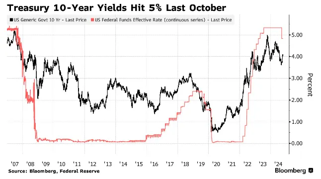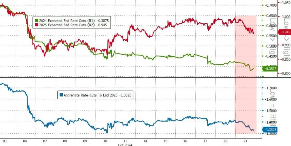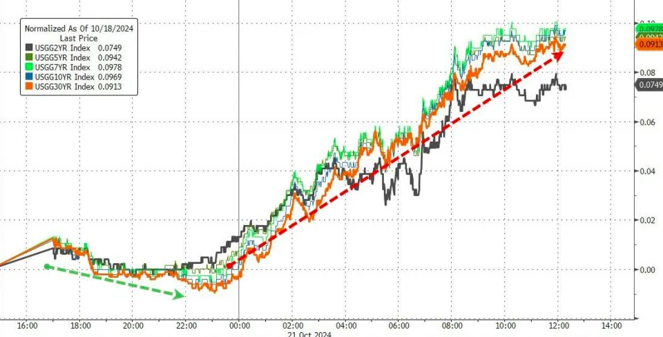 财联社10月22日讯(编辑 潇湘)只管美联储9月一脱手就是50基点的超大降息幅度,然而在一个多月后的今天,这个降息周期似乎越来越“不像”降息周期了…… 你大概很难想象,时至本日依然有华尔街机构预计,10年期美债收益率有望在来岁重返5%关口上方,而陪同着美联储官员对渐进降息的呼声愈发高涨,各限期美债价格周一也全线暴跌,收益率曲线的中长端广泛出现了浮夸的两位数单日基点涨幅…… 这州?不可思议的市场声音和行情变化,一时间似乎令人们不禁心生疑窦: