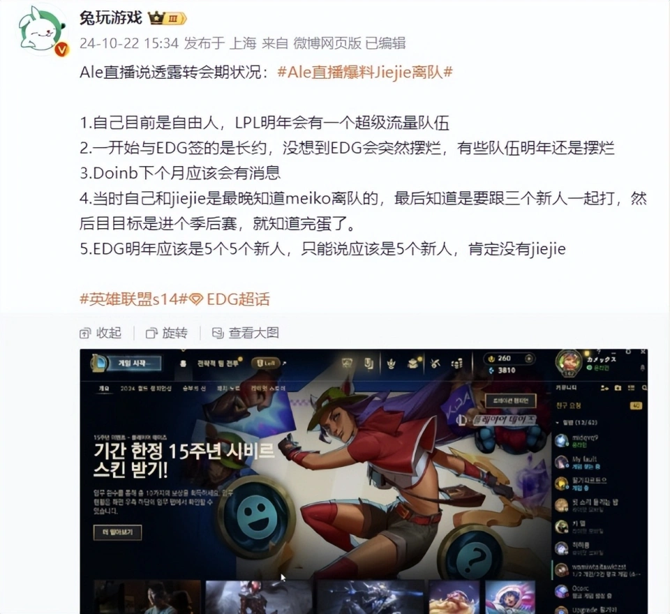 S14环球总决赛8强赛的比赛刚刚结束,转会期的八卦消息就来了。这次不是各大爆料博主的消息,而是AL上单Ale在直播的时间亲口爆料,透露jiejie也要离队了。 Ale爆料的原话如下,一开始有弹幕扣问Ale来岁去那里,是不是要回EDG,他答复:我还不知道去那里,我什么时间回EDG吗?来岁EDG应该是5个新人,5个新人肯定没有jiejie啊,我和jiejie是最晚知道EDG要摆烂的,转会期结束了,我们才知道meiko走了,才知道要跟3个新人一起打的,最开始以为要买一些人的,背面才知道目标是进季后赛,我就知道本年又完蛋了。 而对于来岁LPL的环境,Ale也透露:来岁LPL摆烂的队伍更多了,主要是许多队伍想要退出,但是又找不到接盘的,以是只能摆烂,但来岁会有一支超等流量队伍诞生,来岁LPL的热度应该比本年好一些。 jiejie离队着实有点没想到的,主要是他从出道就在EDG,陪着EDG走过顶峰和低谷,感觉印象中他就是EDG的人,但是说真话职业选手照旧要为本身的职业生存思量,假如来岁EDG照旧新人出战,那么肯定是没有成绩的,jiejie确实没须要再浪费一年,趁着本身状态不错,积极去拼搏下一个冠军,对他来说才是最告急的,以是离队也是可以明白的。 假如jiejie真的走了,那么也宣告着冠军5人组全部告别EDG了。EDG来岁5个新人,meiko也肯定不会回来,以是那支冠军EDG也只能留在回忆中了。 至于说Ale爆料的超等流量战队,估计是theshy新到场的队伍,大概说doinb到场的队伍,感觉只有这两人才会引发超等关注了。而且两人都是要寻求成绩的,到场的队伍肯定不弱,估计也会有许多明星选手做队友,再加上来岁天下赛在国内举行,来岁LPL的热度会比本年高,应该是没什么标题的。固然假如LPL战队能够拿到S14天下赛的冠军,肯定是最有结果进步热度的方式了。 那么,对于Ale的爆料,你们有什么想说的吗?接待在评论区留言探究。 |