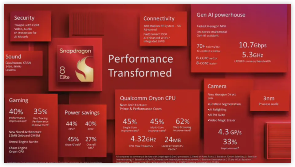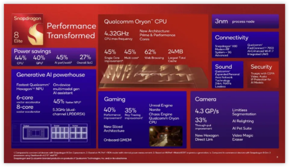 本年应该是许多等等党乐意换机的一年。 前有各家在厚度不怎么变的情况下,疯狂卷电池容量,5500mAh、6000mAh、6500mAh ... 后有台积电大杀四方,订单供不应求,天玑 9400、苹果 A18 系列、以及本日( 22 号)刚刚发布的骁龙 8 Elite,用的都是最新的 N3E 工艺。 寻求游戏性能的朋侪来说,三款顶级处理惩罚器肯定会让他们好好纠结一下,天玑 9400、苹果 A18 系列由于发布的早,性能已经被摸的七七八八了,最晚发布的骁龙 8 Elite 有什么差别?憋了什么大招?性能上有哪些亮点?借着刚发布这会,我们就来浅谈一下。 首先最直接的变化是名字,都自研了,还按照从前规律叫 8 Gen4 多没劲呀,现在叫骁龙 8 Elite ,官方中文即骁龙 8 至尊版。 苹果看着骁龙从容淡定地将 ARM 尸躯撇至一旁,都感到了气氛中某种玄妙的变化。 “骁龙仙友,这下可如何收场?”华子急问。 “没有手臂大人,如何抗衡苹果? !”发弟跺脚, 瞪着骁龙。 骁龙淡笑一声:“很简单,我成尊不就是了?”说完,他气味终于不再粉饰,表现而出。龙哥就是龙! 正如段子中所说... 骁龙 8 至尊版彻底和 ARM 公版架构分手,接纳自研的 Oryon 架构 CPU,由于之前用于电脑上的高通骁龙 X Elite 也叫 Oryon 架构,所以这次手机上的被高通称之为“第二代定制 Oryon ”。 这次全新的 Oryon CPU,包罗名为 Oryon-L 的两个“超级内核”,频率高达 4.32GHz,这个可以说是桌面处理惩罚器的程度了... 高通的原话是,“安卓阵营任何其它内核都无法与之相比。” 而别的六个“性能内核”名为 Oryon-M ,频率高达 3.53GHz ,也非常惊人。 此时回看骁龙 8 Gen3,1+5+2 的架构计划,你会发现,骁龙 8 至尊版从原来的三丛集改成了和苹果 A 系列处理惩罚器相似的两个独立的 CPU 簇计划。 并且,骁龙 8 至尊版的 CPU 簇各接纳 12MB L2 缓存,专门与 CPU 紧密耦合,L2 缓存越大,处理惩罚器访问 L2 缓存的概率就越高,从而进步处理惩罚器的性能。 总计到达 24MB 的大缓存,大概让骁龙 8 至尊版觉得不要 L3 缓存也行,索性去掉了。 不难看出,不管是 CPU 簇的计划上,还是缓存思绪上,高通似乎都有些学习苹果 A 系的意思,等各家的量产机出来后,高通这种换了思绪的打法实战究竟如何?还挺让人等待的。 GPU 方面,骁龙 8 至尊版升级到了最新的 Adreno 830 ,并且和 CPU 一样,这次也是缓存不要钱似的塞了个 12MB 的大缓存,好家伙,这是什么骁龙 8 至尊版 X3D 。 加大缓存的长处显而易见,众所周知,在举行图形渲染时,须要不绝地去搬运图形数据,所以免不了要和内存举行交互,频仍访问内存会明显增长功耗,而 GPU 有了大缓存,不但性能服从得到提升, 还能因大幅淘汰对内存的访问而低沉能耗。 官方表示,相较于上一代在性能上实现了 40% 的提升,同时功耗也低沉了 40%,别的在游戏场景比力看重的光线追踪性能方面,也有高达 35% 的性能提升。 除此之外,作为一套完备的移动平台,骁龙 8 至尊版的其他方面也迎来明显升级。 好比高通 AI 引擎的焦点 Hexagon NPU :现在向量加快器有 6 个焦点,标量加快器有 8 个焦点,用来满意天生式 AI 运算不绝增长的需求。 从性能上看,升级后的 NPU 与前代相比推理速率提升了 45% ,每瓦性能体现提升了 45% 。 而在基于骁龙 8 至尊版运行的多模态助手方面,背后将支持更多模子运作,包罗 LMM 、LLM 、LVM 和 ASR 等。 除此之外,根据极客湾和高通工作职员深度交换后的说法,骁龙 8 至尊版这次在网页欣赏器上的提升是巨大的,根据测试可以看到,对比之前 8 Gen3 的 16.9 分,换上自研架构和大缓存的骁龙 8 至尊版能到达 32.8 分,靠近苹果。 有些人大概不知道,着实像主流的肴杂开辟应用都会涉及到欣赏器网页性能,好比我们平常购物,买外卖,这些吃的都是网页端的性能,所以 Web 的性能翻倍,意味着一样平常体验性能翻倍,当然你也可以说为 App 提供了更多的广告性能... OK ,说了这么多技能方面的提升和改进。现实体现到底如何? 根据大佬极客湾拿到的工程机的测试结果。 骁龙 8 至尊版的焦点面积为 124.1mm 。 CPU 性能:Geekbench6 极限测试,单核 3242 ,超过天玑 9400 ,靠近苹果,多核 10521 ,现在首个破万,没有对手! CPU 能效:团体逾越苹果 A18 Pro 和天玑 9400 ,低频能效持平苹果 A18 Pro 。 值得一提的是,根据图片中可以得出,骁龙 8 至尊在功耗 9W 左右的情况下就能到达天玑 9400 峰值性能。 GPU 能效:非常靠近天玑 9400 ,领先苹果 A18 Pro 。 游戏实测: 原神 864P 满帧功耗 4.5W , 813P 的天玑 9400 是 4.6W ; 星穹铁道整机功耗 6.2W ,和竞争对手天玑 9400 的 6.0W 在伯仲之间。 鸣潮 58.4 帧功耗 5.3W ,能效略微优于天玑 9400 和苹果 A18 Pro 。 总的来说这台工程机上的骁龙 8 至尊版的性能和能效还是很能打的。 但是,工程机之所以叫工程机,一个是芯片特挑,一个是内存高频,如果去掉这两个因素,量产机大概跟工程时机有 10% 左右的能效差距,所以详细还是得以真机为准。 高通在发布会上公布,华硕、光彩、iQOO 、一加、OPPO 、真我、三星、vivo 、小米、复兴、摩托罗拉、努比亚等各大厂商都准备在未来几周推出搭载骁龙 8 Elite 芯片的机型,而这此中小米 15 系列将首先搭载,感爱好的朋侪可以持续关注。 总的来说,高通、苹果、天玑本年的提升都非常大,这又不得不让人担心起麒麟的状况,究竟在制程上是显着亏损的,不外果子以为也不须要太过于焦虑,追赶哪能只靠一朝一夕,能给出一个包管日用流畅的程度,喜欢华为的人依然会购买的。 参