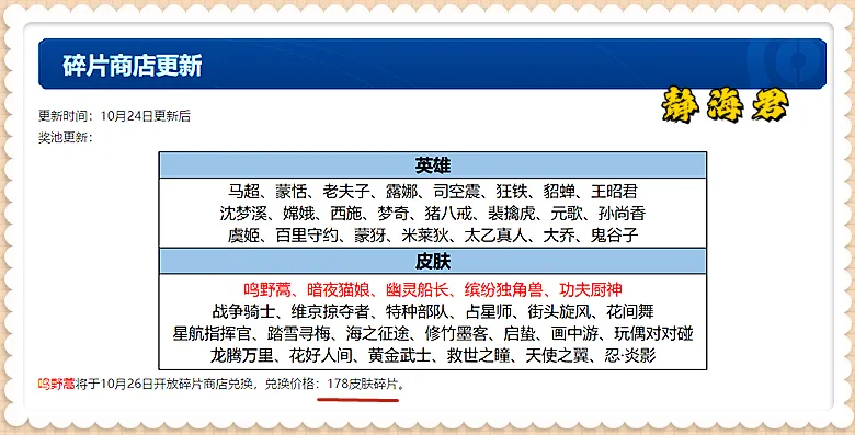 思量到大概确实有玩家无法在运动期间上线,筹谋专门设置了一个保底——运动结束后,和韶光种子相关的夸奖都会通过邮件发放,但前面灵宝装扮、元流之子背饰和限定称号就没有了。 ⑵登岸送11连 在10月26日当天登岸游戏,可以直接领到11个积分夺宝券(10+1)。 从代价来说,11个积分夺宝券=660点券;从实用性角度来说,有概率抽到有数皮肤冰冠公主(雅典娜)、拳王(达摩),天命之子更有大概抽到光彩水晶。 除了登岸送10连运动外,尚有一个单独的积分夺宝券是小王生日笺运动送的,除了积分夺宝券运动外,尚有周年庆限定头像框,皮肤碎片×5,五级铭文卡×1等夸奖。 ⑶别的四个渠道 在10月26日(周年庆)当天,桑启-鸣野蒿开放领取,福卡天降运动首抽必出史诗。别的,上线还可以直接领到25个蔷薇之心(点击右下角灵宝,还能再领2个)。 假如不想做任何运动,玩家还可以在皮肤碎片市肆直接兑换鸣野蒿。 除了鸣野蒿外,尚有包括暗夜猫娘、幽灵船长、缤纷独角兽、功夫厨神等高级皮肤上架碎片市肆。 7款S级皮肤消息第二个重点要介绍的部门是7款S级皮肤的上线。 ⑴周年庆皮肤返场 在10月26日到11月1日这7天内,通过投票选出的6大限定皮肤正式返场,此中: