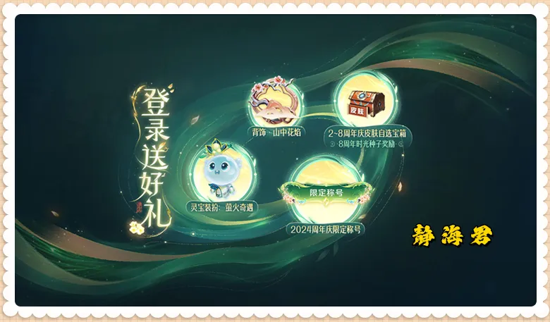 文/静海君 王者光彩正式服10月24日更新,本次更新的焦点关键词是:6款皮肤免费领,7款S级皮肤上架,2名好汉以及草灵调解。 6个可免费领皮肤的渠道作为一个资深的王者光彩玩家,本次周年庆运动的夸奖力度应该是空前的。 ⑴上线直接领皮肤 在10月26日当天,玩家只要登岸游戏,就可以得到萤火奇遇(灵宝装扮)、山中花焰(元流之子背饰)及周年庆限定称号。 对于已经在客岁到场了“韶光种子”播种使命的玩家,还可以得到2种完全差别的夸奖: