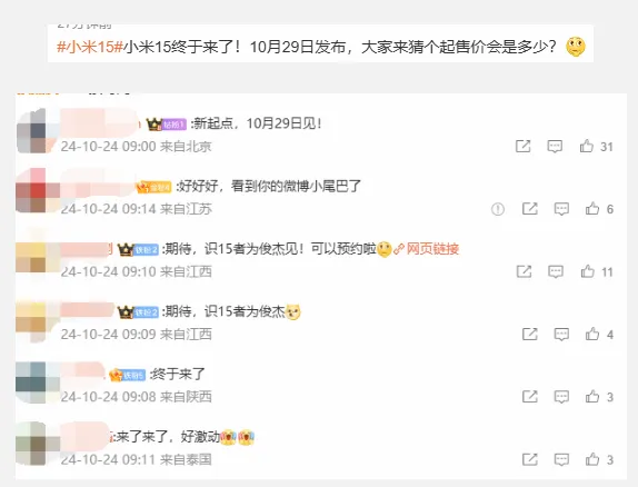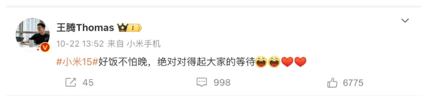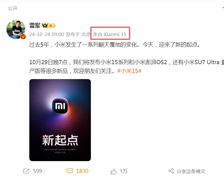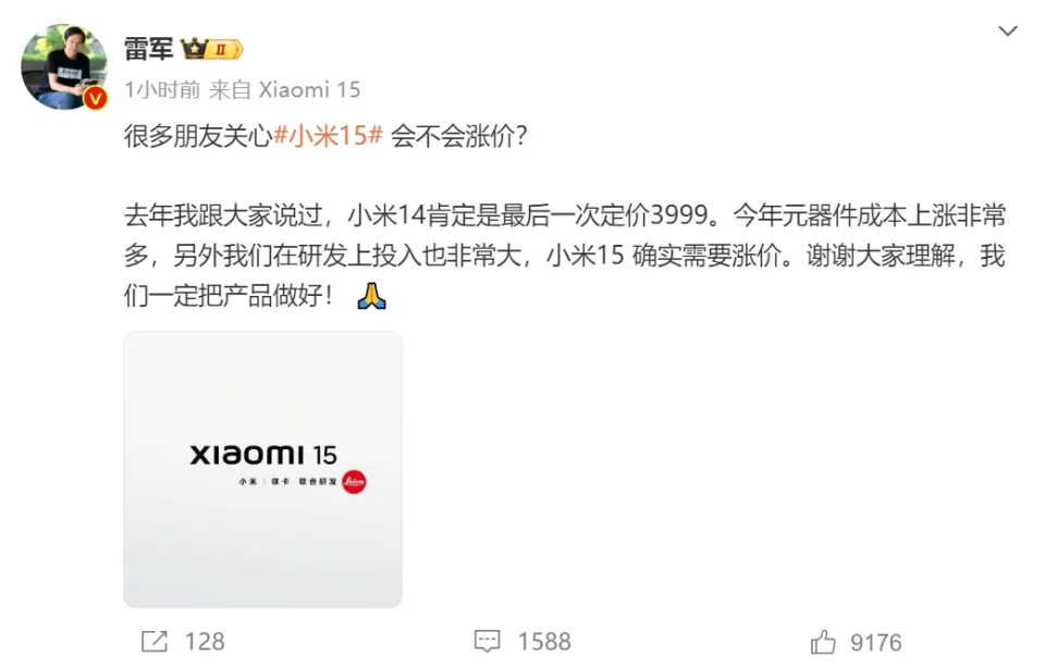 每经编辑:张锦河 10月24日,小米创办人,董事长兼CEO雷军在微博发文:很多朋侪关心小米15会不会涨价?客岁我跟各人说过,小米14肯定是末了一次订价3999。本年元器件成本上涨非常多,别的我们在研发上投入也非常大,小米15确实须要涨价。谢谢各人明确,我们一定把产物做好! 10月24日稍早,雷军发布微博称,已往5年,小米发生了一系列翻天覆地的厘革。本日,迎来了新的出发点。 “10月29日晚7点,我们将发布小米15系列和小米汹涌OS2,另有小米SU7 Ultra量产版等很多新品。”雷军称。 同日,小米团体合资人、总裁卢伟冰也发布微博称,小米15系列、小米汹涌OS2、小米SU7 Ultra量产版将于10月29日晚7点发布,“这是小米新的出发点”。 值得注意的是,二人发布微博的手机型号分别为小米15和小米15 Pro。 10月24日,话题#小米15#冲上热搜。 不少米粉、科技用户表现了对小米15的等待。 近期,小米15多次冲上微博热搜,引发市场广泛关注。作为小米的年度旗舰产物,小米15系列首发搭载了骁龙8至尊版处置惩罚器。小米团体总裁卢伟冰曾表现,新旗舰平台再共同全新汹涌OS全面优化,小米15系列在性能大将实现超过式提拔。 小米公司王腾此前曾在外交媒体上表现:“好饭不怕晚,小米15绝对对得起各人的等待。” 8月21日,小米团体最新财报显示,2024年上半年公司实现营收1643.95亿元,同比增长29.6%,经调解净利润为126.66亿元,同比增长51.3%。 逐日经济消息综合自雷军微博、公开资料 免责声明:本文内容与数据仅供参考,不构成投资发起,利用前请核实。据此利用,风险自担。 |