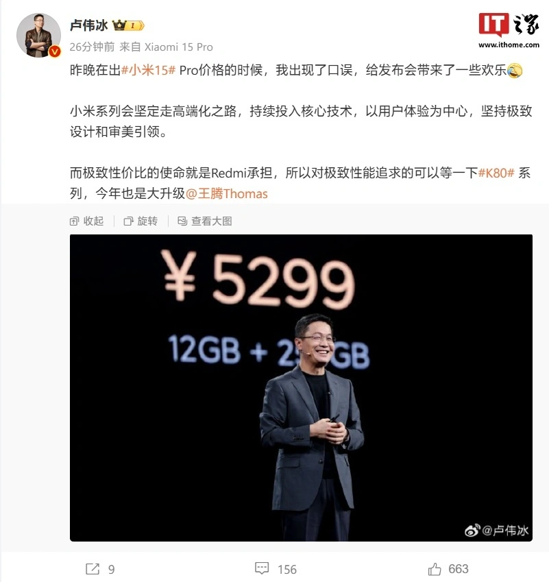 IT之家 10 月 30 日消息,本日上午,小米团体合资人、总裁、手机部总裁卢伟冰在微博上发文称:“昨晚在出小米 15 Pro 代价的时间,我出现了口误,给发布会带来了一些高兴。” 昨晚的发布会上,卢伟冰在发表小米 15 Pro 手机的代价时高声喊出:“…… 小米 15 Pro 的价格,三千……5299 元!”引起全场的惊呼和大笑。IT之家附视频: 卢伟冰同时表现,小米系列会刚强走高端化之路,连续投入焦点技术,以用户体验为中心,对峙极致筹划和审美引领。“而极致性价比的使命就是 Redmi 承担,所以对极致性能追求的可以等一下 K80 系列,本年也是大升级。”同时,他还 @了 Redmi 品牌总司理王腾。 小米 15 Pro 提供了云杉绿、岩石灰以及白色三种版本可选,10 月 31 日早 10 点正式开售。IT之家附各设置代价如下: