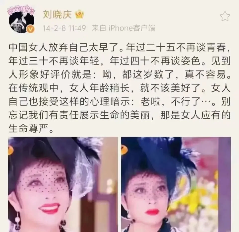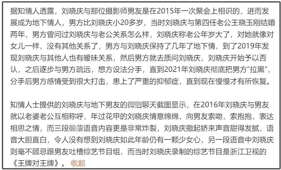 2024年10月30日是刘晓庆74岁生日。 而就在她生日的前一天,她在9年前谈过的一个照相师男友,却爆料给娱乐狗仔,称在2015年,他与刘晓庆结识,并发展为情人关系,而其时,刘晓庆与第四任老公王晓玉刚完婚2年。 这位照相师男友,比刘晓庆小20多岁,两个人保持了几年关系后,照相师发现刘晓庆还与其他夫君暧昧,就去诘问刘晓庆,刘晓庆就开始疏远照相师,之后分手。 照相师称分手后他患上了烦闷症,直到如今才徐徐规复。 狗仔还爆料了刘晓庆与照相师男友在2016年的几段谈天纪录,其时已66岁的刘晓庆,在谈天中向男友索吻、求抱抱,还要求男友的“弹药”留着到他们晤面时候用。 而且爆料的语音中,刘晓庆很会撒娇,声音甜蜜,与男友互动大胆火辣,就像热恋中的少女一样。 所谓刘晓庆出轨的爆料在网络上公布后,刘晓庆敏捷登上了多个热搜。 但网友们的观点见解却出奇同等,都不觉得这有什么大不了的,纷纷说,那咋了? 以致许多网友力挺刘晓庆说,老夫君可以找小女友,庆奶有钱,如今又只身,为什么不可以? 更有人说,张纪中如今头发胡子斑白了,还娶了第三任妻子,年过古稀又当爸呢,他可以,刘晓庆为什么不可以? 另有网友说,“晓庆老男孩”自诉刘晓庆出轨,那么该照相师男友不就是小三吗,为什么女的当小三就被非难怒骂,而男的当小三就没有人说,他反而还敢出来抱怨抱怨,让大家攻击刘晓庆? 更何况这还是9年前的事变了,这照相师居然还生存着2016年的语音谈天纪录,其专心更是令人怀疑。 而网友们对刘晓庆的广泛见解是,晓庆阿姨(奶奶)才是实际版的大女主,一生活得像个传奇。 确实云云。 提起刘晓庆的名字,当年但是家喻户晓。固然如今年轻人都追那些年轻的流量明星,对老一代影星不是那么熟悉,但是“刘晓庆”这个名字,无论男女老少,肯定都听过。 纵然没有看过刘晓庆从前的作品,谁还不知道她演过武则天啊! 另有近些年,刘晓庆又成为了“丫头教”的教主级别人物,谁又没有在网上刷到过“晓庆丫头”的新闻和段子呢。 对于刘晓庆在近些年的影视剧中“扮嫩”,以及她为了留住芳华整容,我持生存态度。 不外说到“扮嫩”,对于刘晓庆来说,应该也是无奈之举。 由于国产影视剧,都在寻求年轻化,向来都是年轻人当主角,中老年演员,无论是演技再牛,咖位再高,都只能当副角。 男演员还好一些,毕竟影戏电视剧题材广泛,角色也多样,但是中年女演员尤其是老年女演员,似乎只能在影视剧中演婆婆妈妈大概奶奶了。 由于国产剧中以中老年人为主角,反映老年人生活的影戏电视剧,可以说黑白常稀缺。 那么喜好演戏,热衷于众星捧月的刘晓庆,为了演主角,也就只好扮嫩了。 固然,这只是一方面缘故原由,另一方面,刘晓庆的确是不平老,以为本身从里到外都还很年轻。 刘晓庆在采访中曾经说过,美国人78岁竞选总统,法国人78岁还在谈爱情,我如今正是光阴! 刘晓庆在2014年还曾经发文感慨,说中国女人放弃本身太早了。 她说,中国女子年过25不再谈芳华,年过30不再谈年轻,年过40不再谈姿色。在传统观念中,女人年岁稍长,就不应优美了,女人本身也担当如许的生理暗示:老啦,不可了……别忘记我们有责任展示生命的魅力,那是女人应有的生命尊严。 刘晓庆这番话说得太好了。 中国大多数女人,风俗于按照习俗来认同和担当本身的身份,25岁该完婚了,该要孩子了,40岁就是中年人了,60岁该当奶奶了,为人要慎重,要有个“老人样”,等等等等。 但人这一辈子,实在不外才短短几十年,相对于宇宙长河来说,不外是一瞬间,以是为什么60岁就不可以有一颗童心,70岁就不能有少女心,不能谈爱情,不能跟男友撒娇呢? 纵使网络已经进化到AI期间了,但许多老观念,却仍旧一代代地流传了下来。 年过60岁,似乎自动进入老年期,自动丧失性别,无论是在子弟还是同龄人眼里,老年人都不应再有情情爱爱,就该失去情欲,失去齐备富丽的想法,变成一个模糊的“中性尊长”。 刘晓庆无论是年轻时候,还是如今74岁,她一直都活得很超前,很大胆,我行我素,敢于做她本身。 刘晓庆曾经创造过多个第一,是引领期间风潮的人物: 她是第一个出自传的明星,是第一个集演员、作家、歌星、贩子、主持人、制片人身份于一身的明星,是第一个下海做交易并进入福布斯排行榜的明星,第一个公开仳离的明星,第一个一连三次得到百花奖最佳女主角的明星,第一个4次饰演慈禧和武则天的明星…… 当年刘晓庆与第二任丈夫陈国军仳离,曾经闹得沸沸扬扬,起因是陈国军在仳离后不忿刘晓庆婚内出轨姜文,于是写了一本书爆料,这本书名字叫《我和刘晓庆不得不说的故事》,由于书名带上了刘晓庆,又是写的花边绯闻,以是当年这本书非常火,陈国军也因此大赚一笔。 记适当年另有人说陈国军靠着仳离的明星妻子发财又着名。 这在今天来说,就是善于炒作吧。 刘晓庆结过4次婚,但都仳离了。 在节目中,主持人杨澜问她,在所谓的道德规范之下,你如许的恋情(出轨)是不是要给你带来极大的贫苦? 刘晓庆大大咧咧地说,没有给我带来什么贫苦,只是给我的老公带来了贫苦。 杨澜又问,是不是由于你太强势,以是夫君们会觉得,跟你在一起很辛劳? 刘晓庆答复说,不辛劳啊,实在我是一个特殊好的妻子,很会照顾人的,以是每一次,他们都会对我很吊唁。 但是为什么她会四结四离呢? 由于刘晓庆觉得婚姻跟人性是相反的(实话,人性本质上