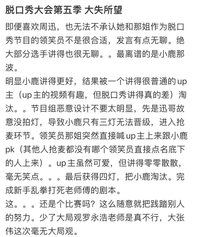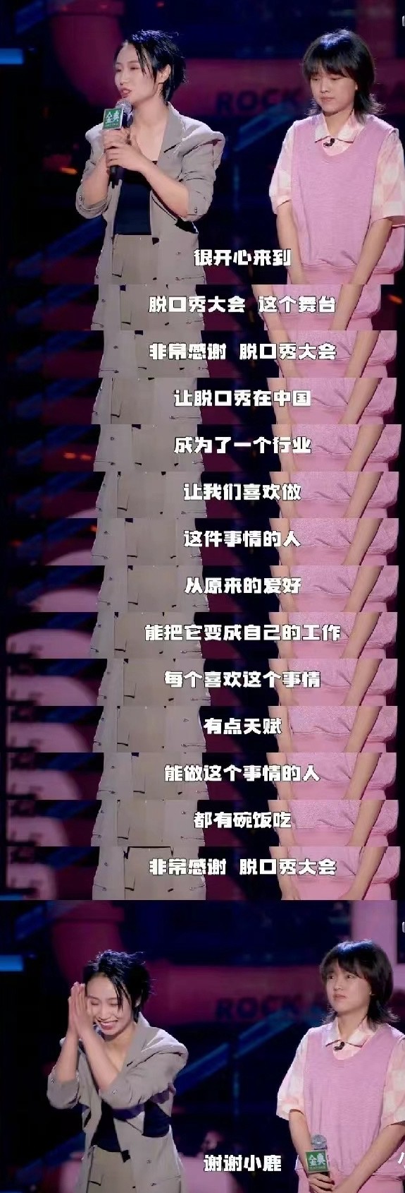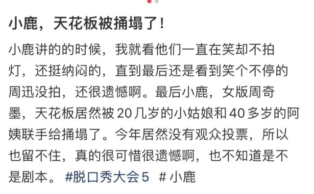 8月30日晚,《脱口秀大会5》第一期播出,此前不绝体现很稳的两位选手小鹿跟张骏被镌汰了,惹来不少网友不满。 张骏: 特殊是小鹿,她评论的是年岁焦急,还模仿了周杰伦夸耀电动车,引来全场笑声,观众都以为她会顺遂晋级,没想到是被镌汰。 小鹿演讲时,台上的几位“领笑员”那英、周迅、大张伟、李诞都鼓掌称好,那英还直呼“过瘾”,然而他们都没有给小鹿“拍灯”,直接导致小鹿输给了对手拉宏桑。 现场的人都体现惊奇: 22岁的拉宏桑首度到场脱口秀大会即获满灯晋级,她在节目上与周迅的互动更被推上热搜,缘故起因是周迅不明确网络用语“芭比Q”(完蛋了)的意思。 小鹿被镌汰,不少网友都怪到周迅身上,由于周迅在节目中透露,自己着迷在小鹿的脱口秀当中,一时开心就忘记给她拍灯! 这是一个令人沮丧的失误,各人都期盼着可以大概救济,发动现场观众投票,惋惜李诞不为所动,没有给小鹿开绿灯。 拉宏桑的演出着实不差,但由于她镌汰了群众根本更结实的小鹿,让她遭到了网友的品评。 有人留言,指拉宏桑的脱口秀是网络烂梗流水账,她可以大概晋级是对全部脱口秀演员的羞辱。 拉宏桑代表了年轻人,她是B站的精良UP主,不少人都喜好直率又可爱的她,但在脱口秀节目上,她体现得远远不及视频内里出色。 观众总结,拉宏桑的演讲非常琐屑,笑点并不多,节奏有点乱,跟小鹿PK的时间更是略占下风,她末了可以大概胜出,多少都会令人产生不解。 周迅这种大咖到场综艺节目,明摆着是流量继承,李诞跟大张伟也没有辜负这张王牌,在节目一开始就拿她跟“马赛克乐队”的吉他手杰出开顽笑。 李诞在开场时就说,自己跟周迅不谋而合去了成都,他去办理仳离手续,周迅则到当地欣赏马赛克乐队的演出。 这个梗一抛出来,观众就炸开了,周迅从来没有公开认可她与杰出恋情,看来此次是“难逃一劫”。 紧接着,小鹿上台评论年岁焦急,李诞立刻向周迅提问,“迅姐听这种年岁焦急,有感触吗”他给周迅挖了一个大坑。 果不其然,周迅掉到了坑里,她很认真地分享自己的履历,李诞很快接过话来,直接指周迅办理年岁焦急的方式是跟年轻人爱情。 此时,大张伟神来一笔,开顽笑说,“这一段打马赛克”,一语双关,既体现话题太隐私不方便播出,又提到了周迅绯闻男友的乐队名字。 周迅没有生气,她直接笑弯了腰,默认了李诞跟大张伟的说法。 周迅(47岁)比杰出年长13岁,两人关系于客岁曝光,同年10月被拍到约会照,年底周迅就将男方带回故乡见亲朋。 假如不较真的话,观众可以将这一段对话看作“周迅官宣恋情”,究竟隔断究竟也不远。 惋惜,在小鹿被镌汰如许的了局下,周迅与杰出的关系无法成为流量暗码,这一点,信任节目组也始料未及。 观众将留意力都给了小鹿,无心再欣赏周迅的“姐弟恋”。 |