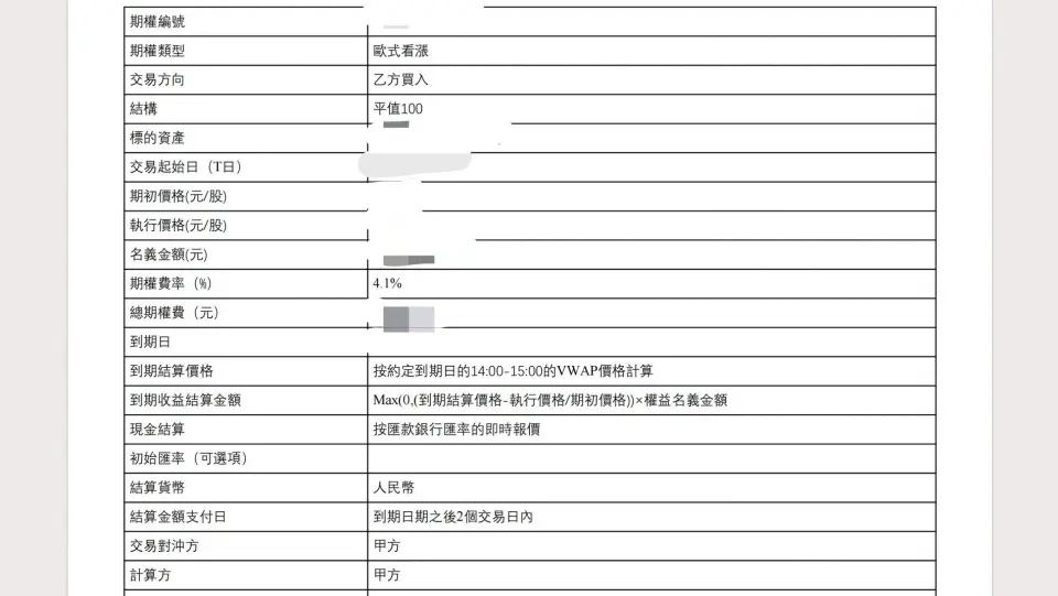 一家涉事香港券商的场外衍生品生意业务确认书截图。图片来源:受访投资者提供 期权费率越低,投资者可以用更低的期权费本金,去行使划一的权利。但在其背后,则是券商为了压缩资本,选择不举行相应的对冲战略。 深圳某从事场外期权相干业务的机构人士李玲告诉期间财经,“因为偶尔间对方(香港券商)给的代价(期权费率)已经远远低于资金资本,我们其时判断对方就是‘裸背’。” 在行业术语中,“裸背”即没有“背靠背”的资产,也就是券商作为看涨期权的卖方,没有持有相应标的的资产与投资者举行对冲,比方对应标的的股票,以应对合约中标的股大涨而带来的亏损,而是直接与投资者“对赌”,如若标的股没有上涨,则投资者不可权,券商就赚取期权费本金。 别的,要达到低资本的底子,券商也只会售卖看涨期权产物。多名投资者和通道人士向期间财经表现,本年香港券商根本上不接“看跌期权”的单子。 李玲对此分析道,售卖“看跌期权”须要券商手上持有标的资产,也就是须要有股有券,这种环境下运营资本会变高许多,但是香港券商的期权费率又很低。 即便提前预知了风险,但券商给出的“4资本金”方案,照旧超出王冲预料。令他无法担当的是,在本身乐意放弃全部收益的环境下,对方竟然不操持全额退还本金。 尚有一名华南券贩子士告诉期间财经,涉事香港券商规模都比较小,抗风险本事较差,对比之下内地券商资金雄厚,在出现划一的行情波动下,也没有出现类似的环境。 通道商的双重风险 在发现多数香港券商没有对冲战略后,李玲就举行了风控,除非客户猛烈要求,否则不会往香港券商下单。 克制现在,李玲手上只有4笔香港券商的单子,都属于同一名客户,虽然有3单现在无法兑付,但有1单可以准期兑付,乃至本金翻了3、4倍。“再加上都是熟人,(团体来看)也相当于回本了,现在协商的敞口就比较大。”李玲泰然自若地说道。 现实上,个人投资者通过通道商去到场个股期权投资,并不符合合规要求。在此底子上,把合约下到香港券商,则是再叠加一层未知的风险。 2020年9月25日,中国证券业协会发布《证券公司场外期权业务管理办法》指出,股票股指类等别的场外期权生意业务对手方,应当是符合《证券期货投资者得当性管理办法》的专业机构投资者。如果是其中的法人机构,则须要满足前述“532资质”。