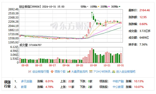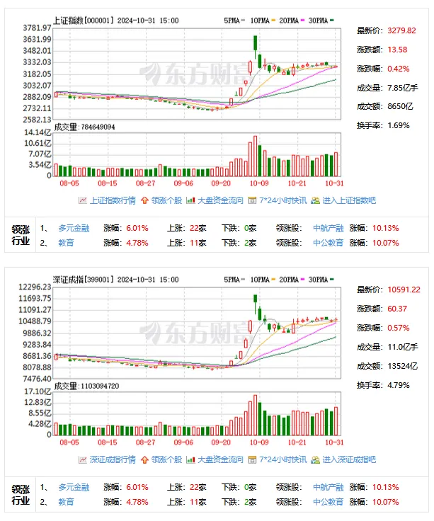 10月31日,市场全天冲高回落,三大指数小幅上涨。停止收盘,沪指涨0.42%,收报3279.82点;深证成指涨0.57%,收报10591.22点;创业板指涨0.60%,收报2164.46点。当天,两市成交额22173亿元,较上一生意业务日放量超3707亿元;大盘资金净流出超537亿元。 个股方面,3512只股票上涨,1721只股票下跌。其中,212只涨停股、14只跌停股。光伏板块掀涨停潮,协鑫集成、国晟科技、双良节能、沐邦高科、晶澳科技、弘元绿能、钧达股份、亿晶光电、清源股份涨停;常山北明、中粮资源、润和软件、银之杰、贝因美等多只高位股尾盘炸板,其中部分个股终极回封。 板块方面,多元金融、光伏装备、辅导、房地产、包装印刷、半导体等行业及光刻机、信托、化债、TOPCON电池、智谱AI等概念涨幅居前。贵金属、非金属材料、小家电、美容照顾护士等行业或中船系、青蒿素、猪肉等概念跌幅居前。 |
