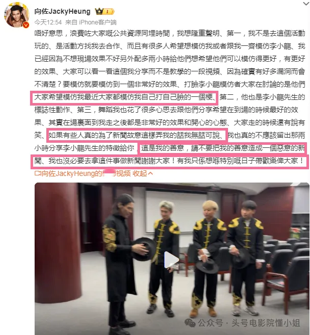 头号影戏院懂小姐(topcinema原创,严禁转载) 人红好坏多,这次轮到“香港最强背景星二代”,向佐。 才由于出演影戏《门前宝地》里摸鼻梁的动作被全网模拟而走红,向佐才开心了没几天,这就惹上贫苦了。 前几天才有高校让门生用向佐的摸鼻梁动作签到,尚有人打着他的旗帜让加粉丝群要交钱。 谁能想到,刚刚,#李小龙模拟者遭向佐扇巴掌#的话题登上了网络热搜第一。 事情是,近日在一场公开活动中,向佐和李小龙模拟者在演出互动中,出现了李小龙模拟者被向佐掌掴扇巴掌的场面。 这一幕被截取下来,在网络上传播开来—— 视频表现,演出互动中,向佐先是和李小龙模拟者在对面相对比划着。 然后,向佐先伸出腿踢了一下,然后靠近搂住对方的脖子。 之后,李小龙模拟者对着向佐伸出大拇指,效果向佐对他的脸部举行了拍打,然后很快松开,和对方快速分离开来。 针对这一幕,当事人方小龙,也就是视频中被向佐打仗的李小龙模拟者,在网上火速公开辟声,他发表了一段视频,写道:“我被他侮辱殴打,也等不到对方给我一个说法#向佐”,反面带上了向佐的标签。 他在视频中报告了事发经过,这段视频上打着几个字:“岂非向华强的儿子就横行霸道了吗?” 他表现本身其时没有做好准备,就被向佐打了,这让他感到不测和不满。 “他(向佐)抱着我,忽然扇了我一巴掌。” 这位李小龙模拟者强调,本身的演出只是出于对李小龙的热爱而举行演出,没想到会被向佐云云对待。 此消息一出,立刻引发网络热议,火速冲上热搜第一,网友们也纷纷发表本身的看法,有的以为是互动效果,有的则以为无论怎样都不应该动手打人。 此前向佐摸鼻梁和本身扇本身的梗在网上走红之后,很多人纷纷模拟,对此也有网友提到大概向佐如许做是在“玩梗”。 但针对玩梗的说法,李小龙模拟者和朋友并不承认,他们表现:“你说你玩个梗,反过来,我给你玩个梗,我扇你一巴掌,能行吗?” 他们以为,这个举动就是欺凌人,“以是说我们这种草根,说白了,就是被他欺凌的,各人评评理。” 别的,李小龙模拟者方面还晒出报警回执单,称对此事已经报警,提出要求向佐公开致歉,并生存接纳进一步法律步伐的权利。 面对已经热搜第一,向佐也很快做出反应,他在本身的交际账号上发长文+晒出一段幕后排演视频举行回应。 向佐说这次事情本身绝非恶意,他提到了三点: 第一,是活动方找他互助,一起模拟李小龙,“打脸李小龙模拟者,各人在讨论的是他们各人渴望模拟我迩来各人都模拟我本身打本身脸的一个梗”。 第二,“他也是李小龙老师的标记性动作”。 第三,各人走的时间尚有说有笑,“如果有些人真的为了消息故意如许弄我的话我无话可说”,“这是我的善意,请不要把我的善意造成一个恶意的消息、我也没须要去拿这件事做消息”。 末了,向佐还强调:我只想在特别的日子带高兴给各人! 也就是说,向佐表现这是一个活动,他和对方一起模拟李小龙,他是在玩梗,之前还和对方一起私下排演了,没有恶意,和对方其时尚有说有笑,不渴望被弄成一个恶意的消息。 几个小时后,向佐又再度发文,还晒出他其时和对方的视频,说:“我只是抽象,不是白痴。不停很难过,明明劈面遇到的都是笑脸善意满满,背后却恶意中伤,歪曲究竟地蹭我。我甘心各人不喜欢我劈面说,不要背后两副面孔。” 对于向佐的回应,网友也是继续讨论发表本身的看法,依然是各人看法差异—— 有人以为向佐提前排演和沟通过,没恶意,人红好坏多,也有人以为说那么多和打人脸不要紧,是不尊重人。 对此,你怎么看? 向佐到底冤不冤? |