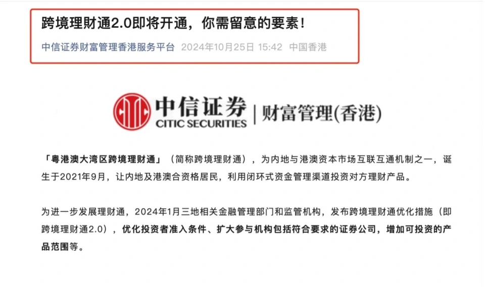 财联社11月1日讯(记者 闫军 林坚)间隔市场传言“券商试点跨境理财通6月尾开闸”一晃5个月已往了,跨境理财通扩容消息再起,团结多家券商近期加紧投教宣传可见,券商试点跨境理财通或将开闸。 本年2月,“跨境理财通”正式迈入2.0阶段。粤港澳大湾区银行业深度参与“跨境理财通”业务试点。最新数据显示,截至本年三季度末,大湾区本地9市已报备试点银行32家,大湾区参与试点个人投资者12.5万人,约为去年同期的两倍,涉及相干资金跨境汇划金额超900亿元,较一季度末增幅217%。 面对爆发式增长的业务机会,券商早已跃跃欲试。本年5月,包罗国信证券、国投证券、中信证券、招商证券、国泰君安证券、华泰证券、广发证券、中金产业等头部券商就已经开始了系统搭建与升级等筹办工作。不外,近期,中金公司、广发证券、招商证券、中信证券、国投证券、平安证券等多家券商再次频繁在官方渠道开展投教,意味着试点落地将近。 跨境理财通是国家推动金融市场互联互通、深化粤港澳金融相助的紧张办法,不但是促进大湾区住民个人跨境投资便利化的一项政策突破,也是推进湾区民生金融、金融市场互联互通的紧张办法与创新安排。不少券商此前曾亮相将抢抓跨境理财通试点机会,加速布局,更好地服务差别地域客户的跨境理财需求。 多家券商近期频繁科普跨境理财通,深意显着 不少券商投教基地等机构积极亮相,将会提供投资者教导和咨询服务,资助投资者更好地明白和参与跨境理财通业务。记者注意到,现在已有券商开展系列“跨境理财通”业务投教遍及工作。 在已往的几个月内,中信证券投教基地、中信证券产业管理香港服务平台、中信证券华南投教基地均连续发布了有关跨境理财通的最新情况以及业务办理的流程。此中,10月25日,中信证券产业管理香港服务平台还以科普文章透露:跨境理财通2.0即将开通,提示投资者注意要素。 10月31日,广发证券在广发证券投教基地推出“跨境理财通Q&A丨第一期:什么是跨境理财通?北向通、南向通又是什么?”的科普文章,从过往推文可知,这是一个系列科普,将围绕投资者所关心的“跨境理财通”细节通过Q&A的方式举行科普。 广发证券投教基地推出“跨境理财通Q&A”7月以来,招商证券已在招商证券投教基地开展系列“跨境理财通”业务投教遍及工作,公司方面告诉财联社记者,后续将继续在官方微信公众号、招商证券APP“跨境理财通”业务专区举行线上投教宣传。 招商证券已在招商证券投教基地开展系列“跨境理财通”业务投教遍及工作不但云云,中金产业特别策划了系列投教内容《“跨境理财通”2.0上车攻略》,已在中金产业投教基地等平台发布,便于投资者相识“跨境理财通”的投资门槛和投资产物。 中金产业特别策划了系列投教内容《“跨境理财通”2.0上车攻略》团体来看,“跨境理财通2.0”业务流程规范,针对投资者准入、单个投资者额度、投资产物范围、跨境宣传销售安排等方面对原有机制举行优化,个人投资者参与门槛低沉,投资产物范围进一步扩容,有助于提拔投资者积极性,开展多元资产设置。 券商试点跨境理财通料想已久 跨境理财通为本地与港澳资源市场互联互通机制之一,诞生于2021年9月,到本年1月本地与港澳三地相干金融管理部门和羁系机构,发布跨境理财通优化步调(即跨境理财通2.0),优化投资者准入条件、扩大参与机构包罗符合要求的证券公司,增长可投资的产物范围等。 根据本年3月1日,广东证监局与深圳证监局同时发布的《证券公司参与粤港澳大湾区跨境理财通业务问答》中流程规定,本地券商可自主选择一家港澳券商作为相助券商(试点初期,本地券商仅可选择一家港澳券商相助,后续拟答应与多家港澳券商相助)。双方需搭建系统以满足理财通资金和额度监督管理要求,并完成系统测试或评估;应根据拟开展“跨境理财通”试点业务主体所在地,分别提交报备质料。 在客户账户开通方面,可以非现场方式开立“北向通”及“南向通”投资户口、可以通过APP等网上开户方式办理“南向通”汇款账户。 对于本地投资者而言,可参与跨境理财通“南向通业务”。参与“南向通”需满足以下要求: