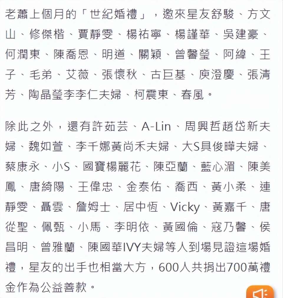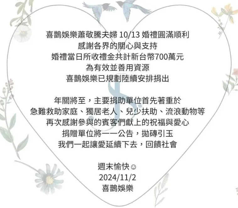 萧敬腾上个月正式迎娶年长13岁经纪人林有慧,两人16年爱情长跑成为娱乐圈的韵事,他们也作出了锦上添花的活动,将现场收到的礼金全部捐出。 11月2日,萧敬腾经纪公司公布,将婚礼收到的700万台币的红包全部捐出,折合人民币156万。这笔钱分别捐给急难救助家庭、独居老人、儿少扶助、流离动物等单位,用行动回馈社会,此举大受好评。 台媒公开了到场婚礼的名单,台湾省半个演艺圈艺人都来了。 这场婚礼耗资台币7位数,全部都是两人自掏腰包,他们还准备了风雅的伴手礼,美食及制服奉上,不让来宾白走一趟,真正做到口碑载道。 不外在大庭广众的之下,萧敬腾的父亲竟公然向林有慧“催生”,希望两人早生贵子。 这一插曲令这对新人非常难过,大概是考虑到公公的尊严,林有慧并未公开回应,反而是小S在事后力挺,让她别放在心上,认为只收?人家的一厢甘心。 两人婚后歇工半个月,台媒在11月2日公开其行踪,原来两人去了日本观光,但却不是二人天下,而是共有20人相随,萧敬腾父母或许也在此中。 萧敬腾在社交平台发布多张照片,他和太太在冲绳岛享受美食和烟花,像小情侣一样手牵手过马路,而51岁的林有慧身段苗条,看起来比实际年事年轻很多。 事实上,林有慧在婚礼上的样子让人眼前一亮,没有一点光阴的陈迹,皮肤和身段都调养得非常好,拥有爱情的滋润,好像满身都充满芳华的活力。 两人由于年事上的差别饱受质疑,萧敬腾则在婚礼上告白,放话要和林有慧相爱八辈子,谈到情深之处更是流下幸福的泪水,却反而被证婚人张小燕吐槽,让他自己哭就好了,别让林有慧哭。 |