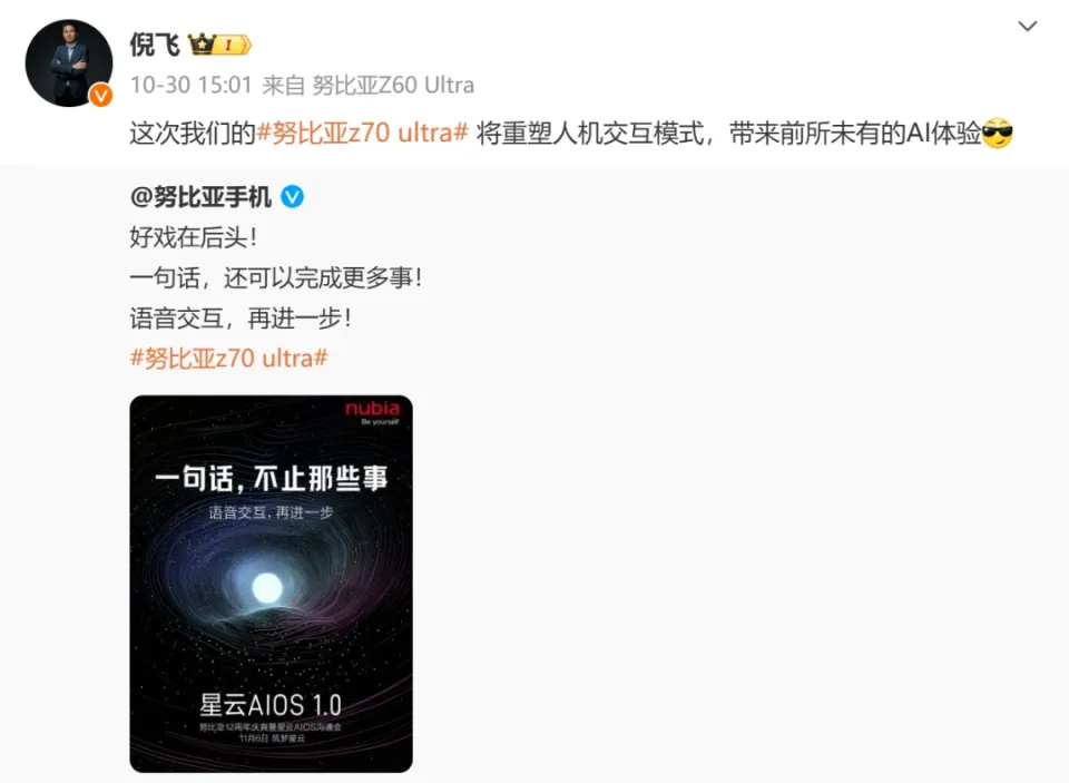 另外,努比亚手机近日还公布,努比亚12周年庆典暨星云AIOS沟通会定档11月6日。