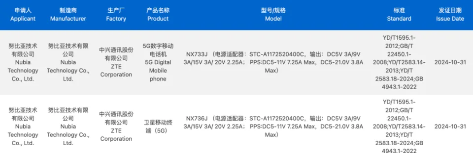 另外,型号为 NX733J、NX736J的两款努比亚旗下新机通过了3C认证。