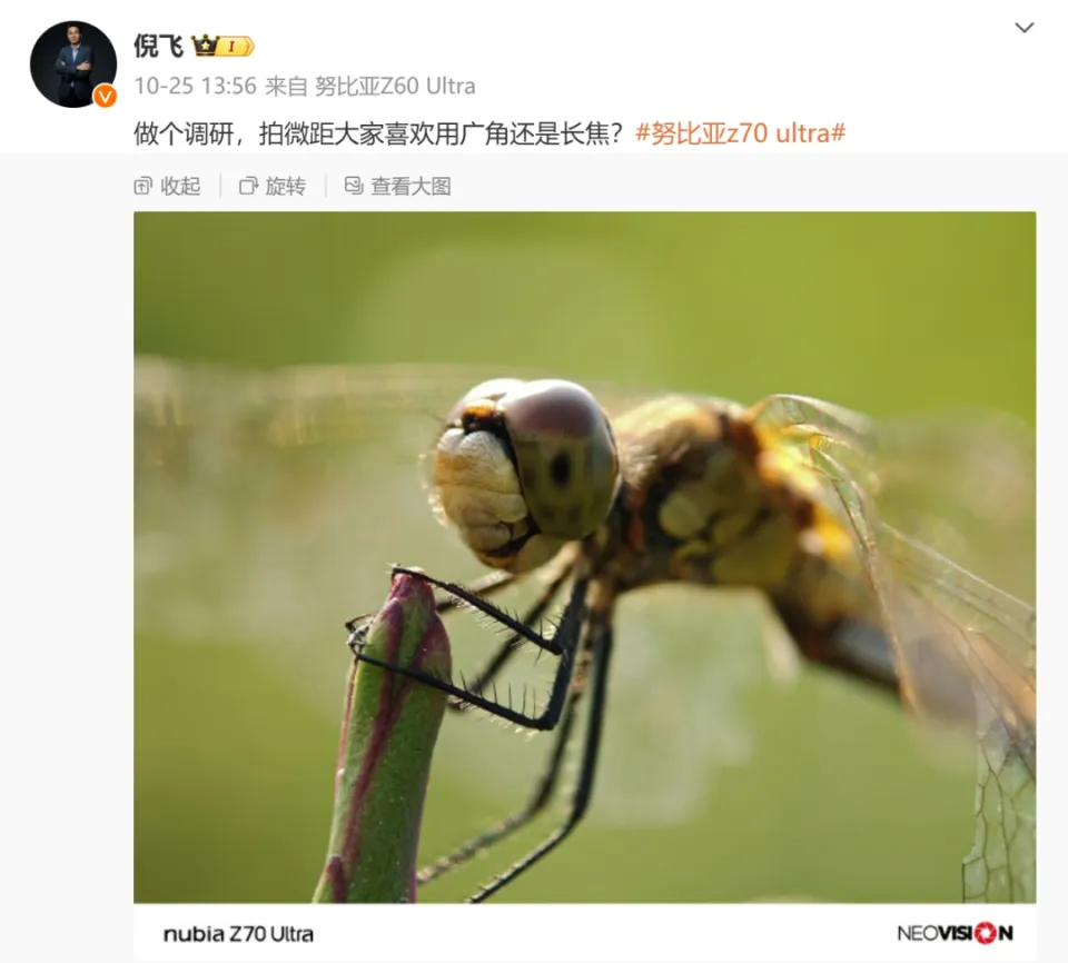 倪飞此前也晒出了几张努比亚Z70 Ultra的拍摄样张,并体现:“做个调研,拍微距各人喜好用广角照旧长焦?”