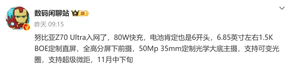 该博主还透露,努比亚Z70 Ultra的电池容量在6000mAh以上;配备6.85英寸左右1.5K京东方定制直屏,接纳全高分屏下前摄技能;后置50Mp 35mm定制光学大底主摄,支持可变光圈、超等微距。