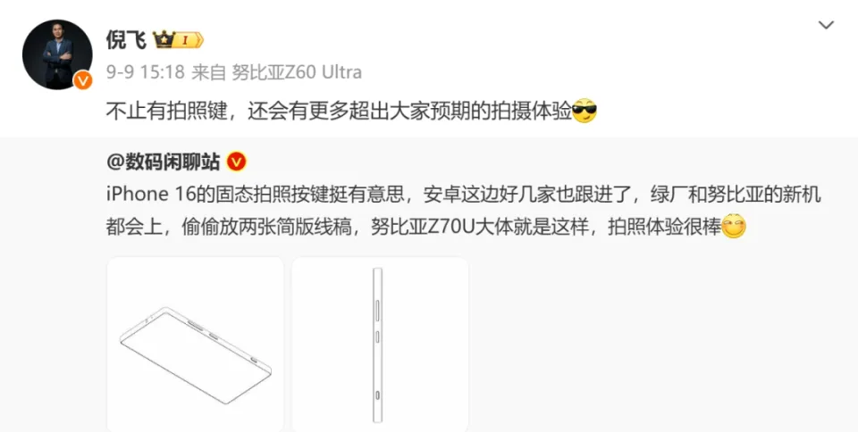 倪飞还透露了,努比亚Z70 UItra将搭载照相按键,“还会有更多超出各人预期的拍摄体验”。