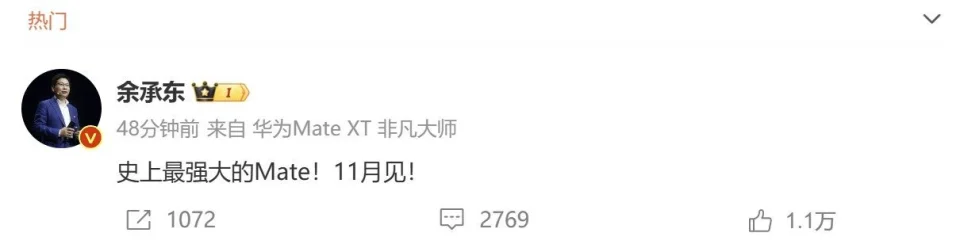 11月4日消息,今日华为常务董事、终端BG董事长、智能汽车办理方案BU董事长余承东在微博发文称:“史上最强大的Mate!11月见! ”。 在本年6月举行的2024光阴为开发者大会上,余承东曾透露,华为Mate 70系列筹划于本年第四序度亮相。联合迩来的微博预热活动,外界广泛推测,即将发布的新机很大概就是备受等候的华为Mate 70系列。 根据此前爆料信息,华为Mate70系列将连续前代的居中大圆形的后置模组设计,团体辨识度很高。别的,华为Mate70系列在机身宽度方面会收窄,以获得更好的握持手感。 在机身正面方面,华为Mate70系列团体与前代差异不大,标准版仍旧接纳“单挖孔”方案,而Pro版本则接纳“三开孔”方案。屏幕则是当下游行的四等边微曲屏的方案。 至于各人最关心的处置处罚器方面,华为Mate 70系列将搭载全新的麒麟处置处罚器,跑分突破110万分,团体无论是性能还是功耗体现都更强。 别的,华为Mate 70系列还将首发“纯血版”的HarmonyOS NEXT操作体系,在流通度、性能、智能化、安全特性等方面提升明显。 |