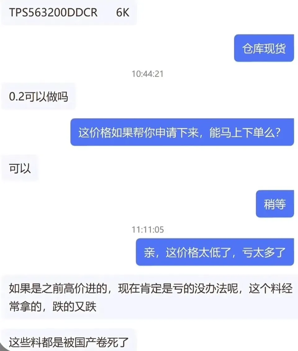 “TPS563200DDCR 0.2元可以吗?” “卷不动啊,这代价太低了!”,TI(德州仪器)芯片搬砖人又遇到一位来杀价的客户。 他表明道:“这颗芯片的资源在4块多,如今连4毛都出不动,亏太多。”对方却说:“没办法,市场上有人出0.23元我都拿不了。如今这些料都被国产卷死了。” 泉源:抖音 从汗青高价上下来,几乎全部TI芯片在现货市场上都贬价锋利,国产替换的助推越来越显着。芯片贩卖们纷纷表现“实在大部门都被替换了”、“能替换的都替换了”,如今,贬价和滞销的中低端TI芯片已经被国产芯片取而代之,国产芯片渐渐上位。 从前是同品牌差别渠道的代价竞争,如今随着一大批国产芯片的涌现,代价自然也随之下跌。就像前两年高高在上的阳光玫瑰,如今只要十块四斤,更多人选择那些把代价打下来的“平替”,近年来德州仪器在中国的营收占比更是出现连续下滑。 那么,国产芯片和TI的代价差别有多大?国产芯片究竟抢占了TI市场的多少份额? 01TI在现货市场彻底凉了6月份我们出了一篇《TI芯片,成烈?担》,随着时间的推移,TI现货市场价继续下跌,如今更为严肃。 某种水平上TI芯片已经和国产一样白菜价了。早些时间较高代价进的货,如今卖低价也拼不外国产替换的代价。 对于“出价0.2元的TPS563200DDCR芯片”,一位TI的芯片贩卖告诉我们,这个代价他们确实也卖不动,很亏。一位圣邦微的贸易商表现,TPS563200DDCR的国产替换确实可以做到两毛,但品牌差别,代价也会差别。另一位圣邦微署理商则表现,这颗料的替换3-4毛有很多,但1-2毛应该没有。 搜刮其他通用的型号如LM358、TPS5430DDAR、TPS51200DRCR等国产替换代价都偏低。 通用运放LM358,TI 市场报价如今在0.26-0.55元不等,而有些国产替换品牌厂商的代价在0.11-0.15元左右,以致有批次两年内的仅需0.08元。一位国产芯片贸易商表现,“如今都是这个代价,自制的估计低过1毛了,国产也是卷飞了。” 降压转换器TPS5430DDAR,如今市场报价降至约0.95元,有国产替换芯片批次两年内低至0.65元。此前缺芯潮中一度暴涨至70元的明星产物TPS51200DRCR,如今降至0.5元,有国产替换芯片在0.7元左右。 有终端朋侪反映TI 的MCU TMS320F28335PGFA 此前跌到50元照旧太贵,除了老产物在使用,新开辟的不会再选28355。如今 TMS320F28335PGFA的市场报价跌至30元左右,市面上已经有国产pin to pin替换产物。 TI芯片国产能替换的都被替换掉了。一位主做国产信号链产物的朋侪看到,这放在另一家模拟芯片品牌ADI身上也存在,ADI一个型号假如是12元,那么国内品牌可以直接杀到6元以内,通用类和其他可替换的根本按照这个比例。 TI的热度整体比起其他品牌也有了显着的下滑,如今热门芯片鲜少,轻微有些热度的,大多数都在贬价,如TPS5430DDAR、ULN2003ADR、TMS320F28335PGFA,有了几分“日薄西山”的感觉。 在现货市场,车规料的生意也并不好做,由于原厂和车厂绑定,缺少大客户支持,TI汽车芯片也卖不动,TPS92692QPWPRQ1、TMS320F28335PGFA等市场代价不停下跌。 TI芯片在现货市场上的淡漠局面,正是伴随着国产替换潮和国产芯片的剧烈内卷。同质化产物的增多,使得每个产物几乎都有了一条平替链。客岁,德州仪器曾一度全面下调中国市场的芯片代价,且表现“没有幅度和底线限定”以抢回市场份额。然而,由于高库存和经济形势的影响,如今终端客户仍旧方向于不备货、少备货。有些对产物要求较低或是想要稳定供应的,纷纷选择了国产芯片。 上半年,与受到汽车和工业需求疲软影响,业绩降幅较大的TI差别,我国的模拟芯片厂商圣邦微、矽力杰、卓胜微等在斲丧类需求旺季驱动下,业绩增长显着,部门国产厂商在模拟芯片范畴占据一部门高地之后,纵然在整体市场低迷的情况下,依然享受着可观的红利。 那么,国产厂商究竟从TI手中抢占了多大的市场呢? 02国产 vs TI究竟替换了多少芯片?自TI“砍署理”转向直销和国产替换大潮之后,TI在中国的市场被蚕食,大量中小客户转向了国产芯片。2021-2023年,TI中国市场的营收占比从25%下滑到19%。 泉源:TI 2023财报 一份国内模拟芯片范畴的调研纪显示,对比TI和ADI这两家模拟芯片巨头,如今在多数门槛较低的产物方面,国内厂商已能覆盖TI约70%-80%的产物,而相对ADI的高难度产物,国内厂商约莫能覆盖其45%。 TI产物线紧张分为模拟(电源和信号链)、嵌入式处理器和其他这三大部门。模拟部门占比最高,2023年收入占74%,其余嵌入式处理器占19%,其他部门占7%。 TI如今有8万多种器件,其模拟部门的电源管理和信号链产物也是国产模拟芯片厂商举行替换的紧张方向。 如今我国模拟芯片上市公司超过30家。电源管理芯片方面,大多国内厂商会合结构在简单的LDO、DC-DC、AC-DC中分立方案上。信号链产物方面,国内厂商中比力少做DAC、比力器、滤波器信号链产物。 泉源:电子发烧友 国内模拟芯片上市企业的产物型号覆盖在上百到上千种不等,如圣邦微有5000多款,矽力杰3000多款,思瑞浦1600多款,英集芯3000多款,杰华特1000多款,其余多在数百款,整体在数目方面照旧远低于TI。 斲丧类应用市场,仍是如今TI国产替换的主流。根据国内上市模拟芯片企业2023年财报,斲丧类应用占比高,少部门涉及工业和汽车应用。 首先是气力较强的矽力杰、圣邦股份,固然在工业级芯片的料号数、覆盖面都处于国内领先,但斲丧类占比依然偏高。 矽力杰以电源管理芯片为主,斲丧电子、工业用品分别占营收的38%、34%;