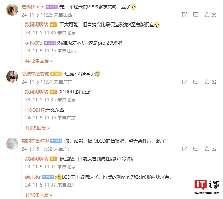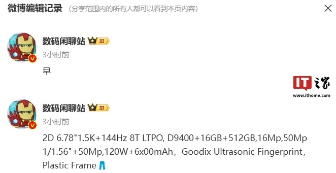 IT之家 11 月 5 日消息,博主@数码闲聊站 本日发文爆料某厂新机,该机搭载天玑 9400 处置惩罚器,配备 6.78 英寸 1.5K 分辨率高刷屏,支持 120W 快充。联合爆料的暗示标志及品评区讨论来看,该机预计为iQOO Neo10 Pro。 博主在品评区中复兴了部分网友的标题:针对新机代价是否为 2299 元,博主称“不太可能,但盲猜会比最自制骁龙 8 至尊版自制”;针对红魔 Ultra 机型被辟谣,博主复兴“X100U 也辟过谣”;针对 LCD 屏的新机环境,博主表现“很遗憾,目前没看到高性能 LCD 新机”。 IT之家整理博主此次新机爆料配置信息如下: