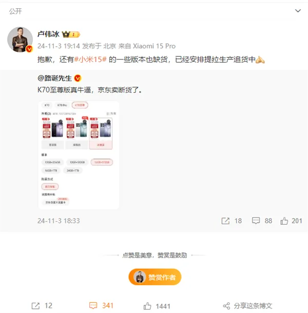 快科技11月5日消息,本日,“小米官方旗舰店”官微发布小米天猫超等品牌日战报,累计成交突破16亿元,创2024天猫超等品牌日贩卖额新记载,革新小米天猫超等品牌日贩卖额新记载。 战报显示,小米15系列斩获了天猫双11国产手机新品销量、贩卖额双冠军,小米15、小米15 Pro和Redmi K70至尊版还霸榜天猫双11手机热卖榜国产手机TOP3。 据相识,小米15系列于10月31日首销,售价4499元起,新机开售多日还卖断货,非常火爆。 小米团体总裁卢伟冰此前表现,小米15的部分版本缺货了,对此他表达歉意,并答应已经安排提拉生产追货。 作为小尺寸旗舰,小米15整机仅宽71.2mm、轻至191g,采取一体航空铝边框,相机Deco为一体化3D冷雕火山口。 手机正面为6.36英寸四窄边直屏,分辨率1.5K,定制M9发光材料,支持120Hz革新率。 小米15 Pro则为2K 6.73英寸等深四曲屏,对比小米14的1.5K屏,小米15 Pro的2K屏的功耗险些类似,整个屏幕的功耗下降了24%。 小米15全系首发高通骁龙8至尊版芯片,搭载5000万像素徕卡三摄,小米15 Pro还搭载了小米14 Ultra同款索尼IMX858潜望式长焦镜头,除支持等效120mm光学定焦外,还支持最高10X无损混淆变焦。 两款机型均预装小米汹涌OS 2利用系统,该系统自研微架构调度器,偏重优化了应用启动速率等方面。 小米表现,小米15系列是小米手机有史以来,开始辈、最流畅、最风雅的数字旗舰。 |