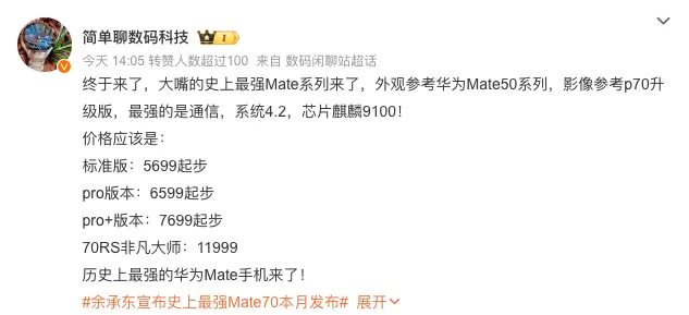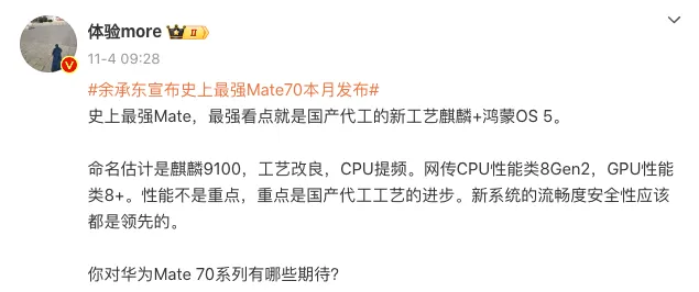 所谓好饭不怕晚,小米、vivo、OPPO、荣耀等手机厂商发布年度旗舰手机新品后,华为Mate 70系列终于也要来了。 2024年11月4日,华为常务董事、终端BG董事长、智能汽车办理方案BU董事长余承东在外交媒体发文称,“史上最强盛的Mate!11月见!”这也意味着,华为Mate 70系列手机将于本月问世。 信任许多小搭档感到好奇的是,华为Mate 70系列手机的表面长什么样?会搭载什么处置惩罚器?有哪些惊喜?下面,我们联合网络上的信息,一起前瞻下华为Mate 70系列手机。 取消双拼色计划,一体性更强 现在,华为Mate 70系列手机的渲染图已经曝光,机身背部取消双屏色计划,改为了纯色计划方案,看上去一体性更强。 博主“科技的那些事”曝光的掩护壳照片表现,华为Mate 70系列手机搭载了圆形镜头模组,内置四颗摄像头,此中Mate 70和Mate 70 Pro闪光灯的位置恰恰相反,前者在镜头模组上方,后者在镜头模组下方。 值得注意的是,现在电商平台还出现了华为Mate 70系列手机高清的手机壳渲染图,后壳居中位置有一圈白色的圆环,推测该系列手机将支持磁吸式无线充电功能。 别的,透过渲染图,还可以看到华为Mate 70系列手机相机模组最中心的XMAGE的logo。据相识,XMAGE影像品牌发布于2022年9月,从光机电算四个维度,创建起XMAGE影像体系的整个体系。推测华为Mate 70系列手机的照相体现会有惊喜。 机身正面,华为Mate 70系列手机将接纳三挖孔全面屏计划,屏幕仍旧是等深四曲,同时做到了四边等宽。爆料信息表现,华为Mate 70系列手机将搭载1.5K分辨率的国产OLED屏幕。 由于屏幕正面有三个挖孔,华为Mate 70系列手机大概会一连前代精良的安全性基因,支持TOF 3D超感技术,可以实现3D人脸辨认,收罗更多面目面貌信息,辨认更精确、更安全。 首发鸿蒙NEXT正式版,体系体验有保障 据“数码闲聊站”透露,华为Mate 70系列手机之以是延期到2024年11月发布,重要是由于在等正式版鸿蒙NEXT操纵体系。 据相识,鸿蒙NEXT发布于2023年8月,是鸿蒙抛弃Linux内核及安卓开放源代码项目等代码的首个大版本,仅支持鸿蒙内核和鸿蒙体系的应用,不再兼容安卓应用。 此后,华为开始推动鸿蒙原生应用适配。2024年10月22日举行的原生鸿蒙之夜暨华为全场景新品发布会上,华为常务董事、终端BG董事长余承东透露,“2024年制止现在,鸿蒙生态设备数量已突破10亿台,已有凌驾1万5千个应用和元服务上架,鸿蒙生态应用和元服务数量相较本年6月份同比增长10倍以上”。据PChome体验,现在常用的微信、付出宝、王者荣耀等国民级应用和游戏都已适配鸿蒙NEXT。 众多开发者支持,使得鸿蒙NEXT敢于迈出公测的步调。2024年10月8日,鸿蒙NEXT正式开启公测。现在,华为Pura 70系列、华为Pocket 2系列、华为MatePad Pro 11英寸2024款等机型都已开始公测鸿蒙NEXT体系。 此前,余承东已经透露,华为Mate 70系列手机将成为首款搭载鸿蒙NEXT正式版体系的智能手机。可以说,鸿蒙NEXT体系的发布,标志着华为在操纵体系领域迈出了紧张的一步,实现了操纵体系焦点技术的自主可控。有鉴于鸿蒙NEXT的生态已经非常繁荣,华为Mate 70系列手机上市后,或将成为智能手机行业的明星单品。 搭载麒麟9100,性能大幅提升 除了搭载鸿蒙NEXT正式版体系,作为年度旗舰手机,华为Mate 70系列的性能也值得等待。 数码博主“体验more”爆料称,华为Mate 70系列手机将搭载麒麟9100处置惩罚器,工艺改良,CPU提频,CPU性能比肩8 Gen2,GPU性能比肩8+。 别的,B站UP主“艾一叨”爆料的信息还表现,由于利用了全新的工艺、制程,麒麟9100单是一颗芯片的资本就冲到了1300-1400元左右。由于搭载的是全新鸿蒙NEXT体系,在华为Mate 70上,麒麟9100的性能至少提升30%,功耗下降20%。 显而易见,麒麟9100芯片与鸿蒙NEXT体系的联合,不但提升了华为Mate 70系列的性能和用户体验,而且在功耗控制、AI智能、体系安全以及生态构建等方面都具有紧张的意义,可以为用户带来更加全面和先进的智能手机体验。凡此种种,将成为华为Mate 70系列手机的焦点竞争力。 主摄接纳OV50K,动态范围极佳 作为华为的年度旗舰手机,华为Mate 70系列手机不但性能配置刁悍,影像配置也不会有短板。 参数方面,着名数码博主“数码闲聊站”爆料称,Mate 70系列的采购物料已经曝光,主摄将用上OV50K,尺寸为1/1.3英寸。 据相识,OV50K传感器的动态范围达到了15EV,凌驾了索尼LTY900的14EV。这一卓越的动态范围使得OV50K可以或许更加精致地捕获光线变革,无论是高亮的高光地区,照旧深邃的阴影部门,都可以或许得到精确呈现。 OV50K可以有用避免过曝和欠曝的征象,确保高光地区的亮度恰如其分,同时保存了暗部细节的丰富层次。这种体现使得图像更加贴合人眼感知,为用户带来更加自然、真实的视觉体验。 备货远超Mate 60,华为Mate 70终于不再是“电子茅台” 看完华为Mate 70系列手机配置的前瞻信息,可能许多人对这款手机的备货环境感到好奇。毕竟,产物再精彩,买不到也很让人扫兴。 2024年10月末,财联社援引供应链处的消息称,从9月份开始,华为Mate 70系列零部件已开始供货。据相识,华为Mate 70系列初期备货量比Mate 60系列多了至少三分之一。 事实上,为了尽可能满足市场的需要,现在华为Mate 70系列已经一连到达经销商手中。数码博主“施兄评测”爆料称, 华为Mate 70系列手机在未发布条件前拆封,将会被罚款50万元起。由此来看,华为Mate 70系列手机的供货或将非常充沛,不会再出现一机