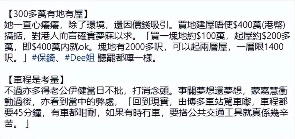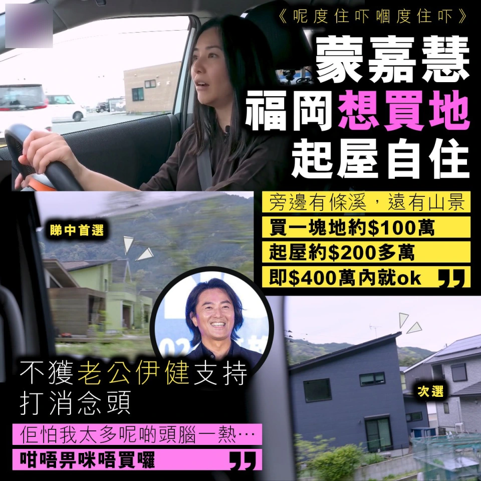TVB昔日花旦蒙嘉慧克日复出拍摄旅游节目,逐一先容她在日本隐居生存。 蒙嘉慧四年前转行当房产中介,由于疫情关闭了在中国香港的办公室,专心谋划在日本的公司,继而被传出移民日本,蒙嘉慧对此不置可否,夸大一半时间在日本生存。 据港媒11月8日报道,蒙嘉慧在节目中谈及想在日本买地、购房的计划,她说本身求之不得的东西,是在日本福冈的山脚下买一块地,一开始看中一块,但很快就被人买了,近期又看中另一块地,近200平方米的地盘只要100万港币,盖房子要花200多万,建个2层的房子需400万港币,相较寸土寸金的香港,相称划算。 不外,蒙嘉慧的计划被郑伊健反对,她说当天就由于丈夫反对而取消动机,原来郑伊健跟她分析,那块地离市区很远,开车要45分钟,如果没车外出会很辛劳,加受骗地没有自来水,喝的都是山上水,每个月要缴维修费,加之盖房子要找指定的修建公司,手续费也是大头。 虽然问题许多,但如果蒙嘉慧财力雄厚的话,激动一下也无妨,毕竟400万港币对演艺圈明星而言不是许多,花这笔钱都要找丈夫商量,一方面分析女方在家中谈不上是“话事人”,另一方面也分析蒙嘉慧积贮不多。 现实上,香港明星在海外购房的人许多,梁朝伟本年就被曝在日本买地建房子,而太太刘嘉玲从不干涉,两人产业独立,刘嘉玲手握大量房产,身家超8亿。 蒙嘉慧无法与刘嘉玲比财力,她在TVB当红十多年,收入实在不高,近年投资百万做房产中介,听说也是郑伊健出的钱,痛惜谋划不善没什么转机,否则也不会复出捞金,退圈4年只出不进,积贮越来越少,自然要服从郑伊健的安排。 有传郑伊健坐拥过亿,所有房产都在香港,至今一套没有卖,郑伊健多次澄清没有移民日本,也没有购房的计划,但蒙嘉慧则不置可否,又在节目中亮相想买地建房子在日本长住,看来两人对此已有分歧。 据港媒报道,郑伊健的父母在香港生存,想来这是他不停不走的缘故原由。 |