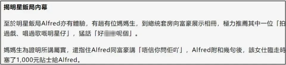最近娱乐圈可谓大瓜不断,不知道是不是注意到了西欧圈吹牛老爹派对的热度,港媒竟然揭自家短了,报道了港圈明星饭局的代价,固然出现的明星大多名不见经传,可是扳连出的娱乐圈黑幕还是值得一观。 根据港媒报道,TVB女星时常接到饭局邀约,最近一位名叫麦诗晴的TVB小花,就被人出价五十万港币,折合成人民币也有四十多万了。 不外麦诗晴还是很有骨气的,选择对外曝光了联结人,绝不客气回怼表现女演员的工作不包罗这些(饭局)范畴,以为很侮辱人。 随后港媒还盘点了一批接到过报价的TVB女星,不知道是不是港星过于接地气,以及TVB出了名的工资低,像蔡思贝、冯盈盈等人都被出过价,大概给出20万一晚、大概给出1000万一次,许多时间都是联系到明星本人。 更微妙的是,有的出价是简体字。 固然没有点名道姓,但是有旅店工作职员上节目爆料过饭局黑幕,有本地富豪一晚找来40多个不同国籍的女生一起和朋侪玩。 尚有负责人拿着名单让人选,这个唱过歌谁人演过戏,一点都不掩藏避讳,当着工作职员的面就开始保举对方很会玩,工作职员在一旁帮助说了一句话,富豪担当了保举,负责人转头就给了工作职员一千块小费。 实际上,本地早就实锤了明星饭局黑幕,还记得王丽坤前夫诈骗案吗?知情人可是点名道姓了哦,爆料表现王丽坤前夫给女星贾某和赵某某转账上百万。 比及王丽坤前夫诈骗案正式开庭,案件被告透露,王丽坤前夫花了几百万去嫖小明星,便宜的几万块贵的十几万,名单都有了,只是各人都不敢提而已。 固然了,由于娱乐圈名利场属性,饭局和饭局之间也是有所不同的,内娱有业内就提到过,有人会为了上位来者不拒,给钱就去,也有人到场的饭局没那么乱,把人哄得开心了,聊一聊就能有资源——以及饭局这事不分男女明星的哦。 实在只要关注娱乐圈,会发现“饭局”属于一个笼统的概念,特别是上位了的大明星,已经很少涉及身段局了,许多时间都是单纯交际吃饭,乃至交际都摆在明面上,放到公共场合谁都能看到,只是不管是大明星还是小明星,他们在饭局上的表现都很轻易让人幻灭。 吴磊、杨洋等人到场奢侈品大牌晚宴,有人夸了一句吴磊项链悦目,他就立马保举别人购买,半开打趣说本身有提成,对方被哄得非常开心,开口就回了一句要买,就当请吴磊喝奶茶,你来我往互动那叫一个熟练。 杨洋一整晚都被富婆包围,还被讥讽是晚宴销量冠军。 baby敬酒照当属最经典,现在看来仍然以为震撼,尚有爆料称,疯马秀之后,baby为了资源频仍到场饭局,搞得身心俱疲,如果把baby敬酒照和黄晓明整理baby裙子照放在一起看,更以为唏嘘了呢。 末了就还是那句话,明星大多是资源工具,娱乐圈发展至今,早就形成了默认规则,追星可以,但不要太过真情实感,记得避开资源通过明星制造的斲丧陷阱。 本文未经授权严禁转载违者必究! |