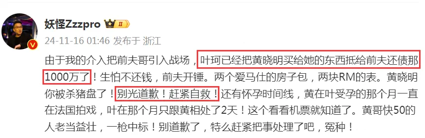 11月16日破晓,黄晓明就女友近期舆论风波致歉后,博主“妖怪”再爆猛料,称叶珂已经把黄晓明买给她的东西抵给前夫还1000万债了,并透露叶珂前夫是怕叶珂不还钱才开锤的。 “妖怪”指叶珂抵了两个爱马仕的房子包和两块RM的表给前夫,来平息来自前夫的怒火。 “妖怪”还喊话黄晓明,称他遭到了杀猪盘,让他自己赶紧自救,指叶珂有身的当月,黄晓明不停在法国拍戏,两人只相处了两天就有身,质疑叶珂是否怀的黄晓明孩子。 “妖怪”不停喊黄晓明是冤种,让他别被骗被骗。 不外“妖怪”的言论并没有拿出实际证据,只是他的推测,固然黄晓明很蜜意,但信托他也不傻。 叶珂也在黄晓明致歉后,用举措彻底与网络告别,已经正式注销了外交账号,此前她发文退网被网友戏称是40%微退,此次注销算是彻底退网了。 前段时间,黄晓明的女友叶珂因一系列的不妥言论和举动,引发了网友的不满和质疑,这也让黄晓明受到连累,让他备受争议。 面对舆论争议,黄晓明却用缄默沉静来面对,既没有明确公开维护叶珂,也没有与其划清界限的模棱两可态度,让部门网友以为他没有继承。 然而,在11月15日晚,黄晓明在媒体面前,大胆回应了近期的舆论争议,彻底站到了叶珂身前,替女友负担了统统舆论压力。 如今叶珂已经彻底退网,回归家庭远离舆论,黄晓明借着新片首映礼的机遇,显现了他对叶珂的真爱和掩护欲。 在女友面对巨大舆论压力时,黄晓明选择自告奋勇,用这种极具诚意的方式来掩护叶珂。这表明他对这段感情的重视程度,愿意为了维护叶珂而将公众的矛头引向自己。可见他对女友的疼惜,特别是叶珂已经有身,这时间的黄晓明有着猛烈的掩护欲。 黄晓明体现对于最近的事真的非常歉仄,心田真的很惆怅,但是没有办法,答应肯定会处理惩罚好私事,并再次说了对不起,陪同着他深深一鞠躬,致以他最大歉意。 黄晓明为叶珂引起的舆论风波致歉,可见在女友遇到困难时他没有置身事外,让叶珂独自面对舆论的攻击,负担起了作为男友的责任。 这也不难发现,黄晓明对叶珂确实是真爱,难怪很多网友都说黄晓明有点“爱情脑”,而且两人已经在一起两年多,此次黄晓明能站出来,让两人将来的大概更加清朗。 着实早在2022年元宵节,黄晓明与叶珂手工熊猫汤圆的同框开始,两人的恋情就藏不住了,后续两人一系列密切场景的曝光,令他们的恋情徐徐从幕后走向台前,直到两人官宣。