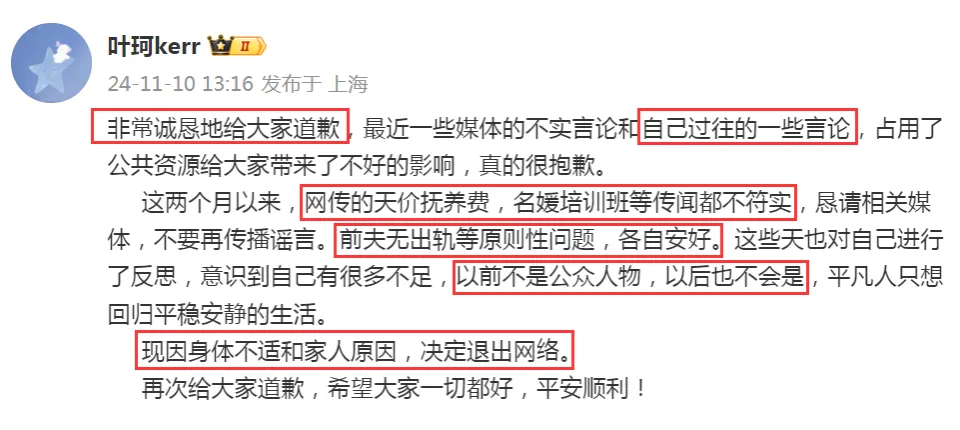 最终,叶珂的人设,在“名媛培训班”、“2.7亿分手费”、“学历造假”、“假富婆”、“有身” 等传闻中彻底崩塌,最终选择退网。