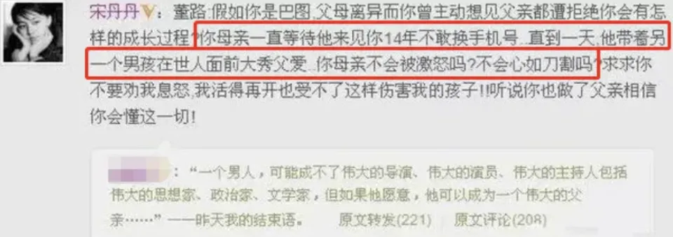 英达有两个儿子。 一个叫巴图,和前妻宋丹丹生的。 一个叫英如镝,和现任老婆梁欢生的。 巴图大家比力熟悉,在娱乐圈发展,演过戏,跟着宋丹丹上了不少综艺,算是比力脸熟的艺人。 英如镝比力少出如今公众视野,他走的跟其他星二代不一样的道路——职业冰球运动员,2022年参加冬奥会才被更多人熟知。 在对待两个儿子上,英达呈现出了两种极度的态度,对巴图不闻不问,淡漠至极;对英如镝则是把他视作心头肉,天上的月亮都恨不得摘下来给他。 都是亲骨肉,英达为何厚此薄彼区别对待? 这就不得不说他跟宋丹丹的那些恩恩怨怨了。 宋丹丹和英达之前都各自有过一段短暂的婚姻,1987年他们因话剧《纵火犯》结缘,1989年完婚,1990年儿子巴图出生。(巴图本名英如镔) 婚后宋丹丹就依附春晚小品《懒汉相亲》和《超声游击队》走红天下,英达的古迹稍逊一筹。 英达出身王谢,从小就被人称英若诚的儿子,完婚后又被称作是宋丹丹的丈夫,仿佛他没著名字一样,这让他很不是滋味,多年后仍然耿耿于怀。 直到1993年他执导的家庭情景笑剧《我爱我家》才让他古迹一飞冲天,成为一线导演。 也就是在拍《我爱我家》的时间英达出轨了梁欢。 梁欢有两个哥哥,一个是《我爱我家》的编剧梁左,一个是主演梁天。 宋丹丹又是《我爱我家》的主演,英达和梁欢的这段婚外情就是在她的眼皮子底下发生的。 梁左和梁天都尽力反对妹妹参与宋丹丹和英达的婚姻,但架不住这两位铁了心要在一起,厥后他们完婚梁天都不参加婚礼。 英达好面子,想仳离但是又不乐意背上负心汉的名头,就一边冷暴力宋丹丹,一边拖着。 宋丹丹也是个狠人,非常地要强,赶在英达开口前自动提出仳离,并且召开辟布会宣告本身有外遇。 宋丹丹虽称本身有外遇,但怎么看都更像是对英达的抨击。 仳离后两人打嘴仗打了许多年。 固然感情破裂但不得不认可他们是天生的知己,都知道对方的痛点在哪里,脱手快狠准。 宋丹丹知道英达好面子,就开辟布会宣告本身有外遇送他一顶帽子,这还不够还出了本自传给英达封了个铁帽子王。 气得英达破口痛骂宋丹丹有生理疾病。 英达知道宋丹丹的软肋是巴图,就刻意忽视巴图甚至公开羞辱他,给两儿子制造对比。 果不其然一提到儿子宋丹丹一点就炸。 娱乐圈仳离的夫妻许多,闹得不愉快不面子的更是不在少数,但像英达如许把夫妻恩怨迁怒到孩子身上的真的很少见,做到他这种程度的更是微乎其微,找不出几个。 可以说他对巴图毫无舐犊之情,直接忽略他当他不存在了。 巴图7岁时,哀求英达带他出去玩,英达理都不理。 11岁管英达要电话号码,英达狠心拒绝。 更绝的是,巴图的爷爷英若诚去世,英达都没有关照他们,巴图不光没见上爷爷末了一面,连他的坟场在哪都不知道。 仳离14年,英达对巴图不闻不问,绝不关心,宋丹丹14年没换过号码就是担心英达哪一天想孩子了接洽不上他,但巴图从来没比及过父亲打来的电话,父子俩形同陌路。 对于这些不近情面的办法,英达堂而皇之地复兴:仳离了就不应该再来找他,他不想伤害如今的孩子,由于他不知道小儿子会不会乐意跟另一个孩子分享父爱。 拒绝跟巴图见面,也是想让巴图好好采取他的后爹,如果他们再见面临后爹不公平。(这都什么歪理) 说他跟巴图的父子缘分已尽。 反正在他看来离了婚就要跟已往切割,把原来的一页彻底翻已往,包罗不见前妻和孩子。 在巴图最需要父爱的年纪,英达都不曾回应和分析过。 这边他对巴图有多绝情,那里对小儿子就有多疼爱。 他给小儿子取名英如镝(瞅瞅这名字取的),希望他将来能像箭一样不屈不挠,小名巴彦。 由于他以为跟巴图的父子缘太短以是他要把统统都增补在小儿子身上。 英如镝从小就享受着满满的父爱,英达对他的作育更是费时费钱费心费力。 英如镝三岁的时间英达就带他去实验各种爱好特长,钢琴、绘画、音乐、滑冰、滑雪……末了发现英如镝在冰球项目有天禀。 冰球就算是放到今天也是小众高端的运动项目,每年练习费、参赛费、装备更新等所有开支加起来,不低于40万元。 英达非常舍得,他给儿子买的练习装备都是最好的,选的锻练也是名师,为了方便英如镝练习,英达还斥资建了一个冰场。 英如镝长大后英达更是一口气把他送到了美国芝加哥让他担当更好的培训。 为了让英如镝在国外住得更好一些,英达不吝负债在美国买了房子。 儿子生活中的许多事他也是亲力亲为,当他的厨师、司机、保姆和锻练,可以说英达为了英如镝倾尽了全部的心力和爱。 在公众眼前,他也绝不粉饰地把这份浓浓的父爱表达出来。 带着英如镝上节目秀父子情,极其煽情。 “肯定要把巴彦作育成一个乐成的人,只有巴彦乐成了才配得起这个姓氏” “巴彦是英氏家属的第五代后人” 如果上外太空答应带三样东西,他选择带册本、莫扎特的CD和英如镝的照片。 从前不乐意被人称作是英若诚儿子,宋丹丹丈夫的他,如今更乐意被人叫做是英如镝的爸爸,这让他很光荣。 在英达的作育下,英如镝的冰球古迹确实发展得不错,2022年的北京冬奥会他代表国家参赛了。 每次提起英如镝,英达的自满感都溢出屏幕了。 他的每一次秀父子情无疑都是在往巴图和宋丹丹的心口上插刀。 对英如镝视若珍宝,对巴图不闻不问,难怪宋丹丹不由得要出来骂他了。 这两年也不知道发生了啥,从前说父子俩缘分
